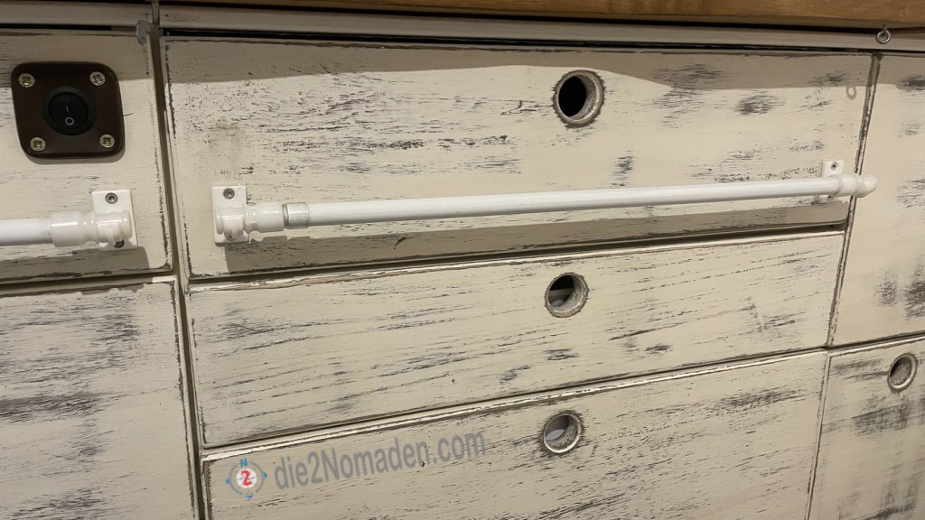Der erste Baumarkt wurde angesteuert und ausziehbare Gardinenstangen samt Halter gekauft. Nicht, dass wir so breite Laden hätten, aber „ausziehbar“ deshalb, da diese eher dünnen Alurohre im Endeffekt doppelt genommen werden können und so der Geschirrtuchhalter doch mehr Stabilität hat.