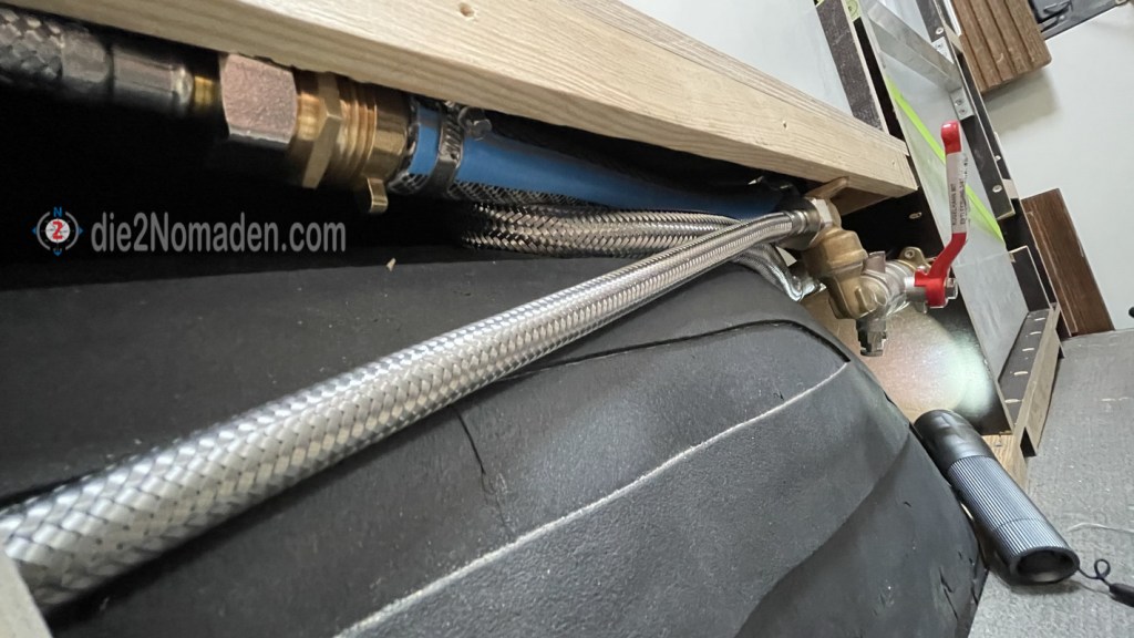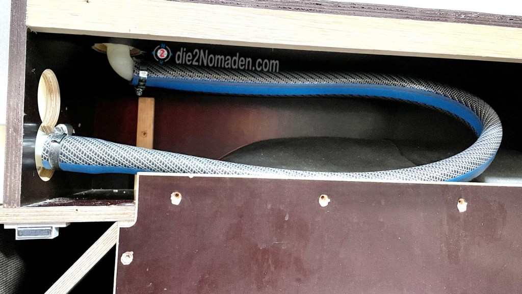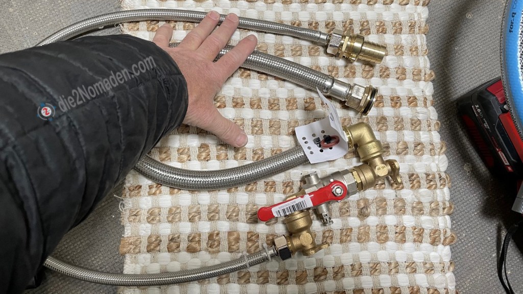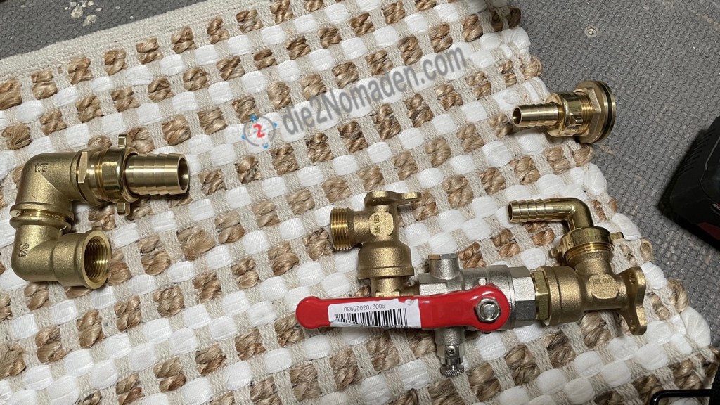 Die Campingverbindungen haben wir entfernt und durch normale Haushaltsverbinder ersetzt. Den kurzen Weg zwischen den beiden Tanks, welche trotz verzurrter Tanks, die Bewegungen nicht auffangen konnten, haben wir durch einen längeren Weg mittel eines 1,5 „-Schlauches ersetzt.
