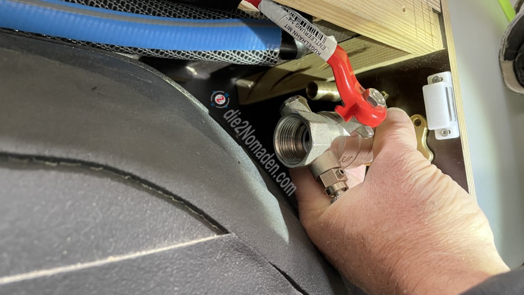 Aus diesem Grunde haben wir zwischen beiden Frischwassertanks einen haushaltsüblichen 1/2″ Absperrhahn montiert.