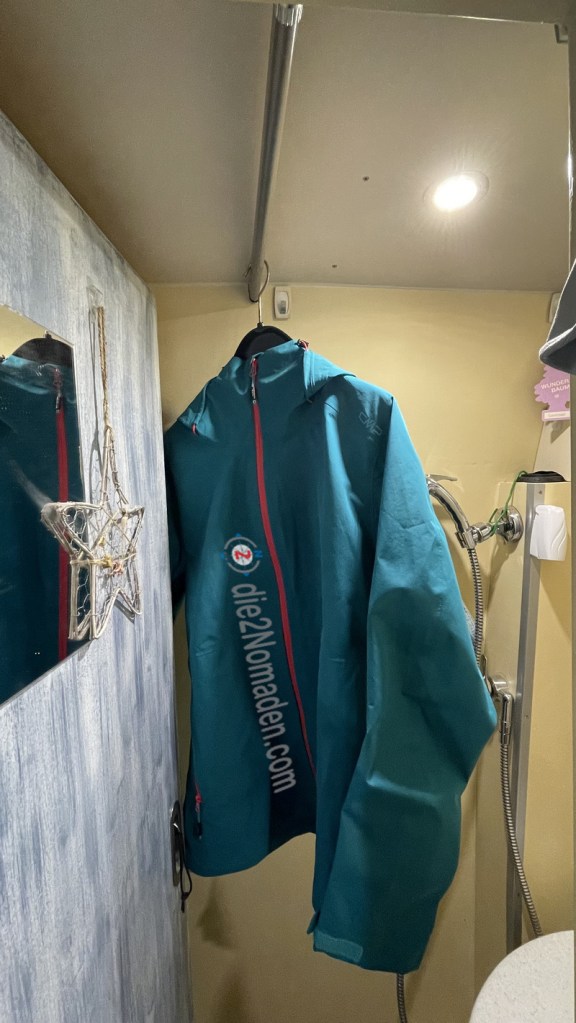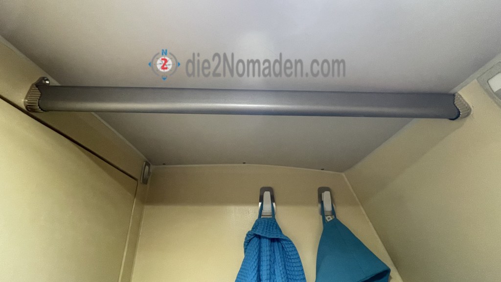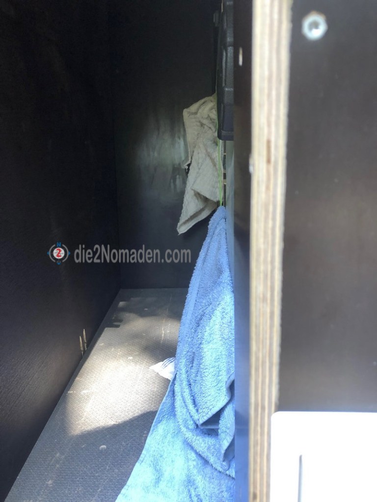 Feuchte Jacken lassen wir im Feuchtraumbereich der Dusche abtropfen. Dazu haben wir eine abnehmbare Kleiderstange mittig der Duschtasse montiert.