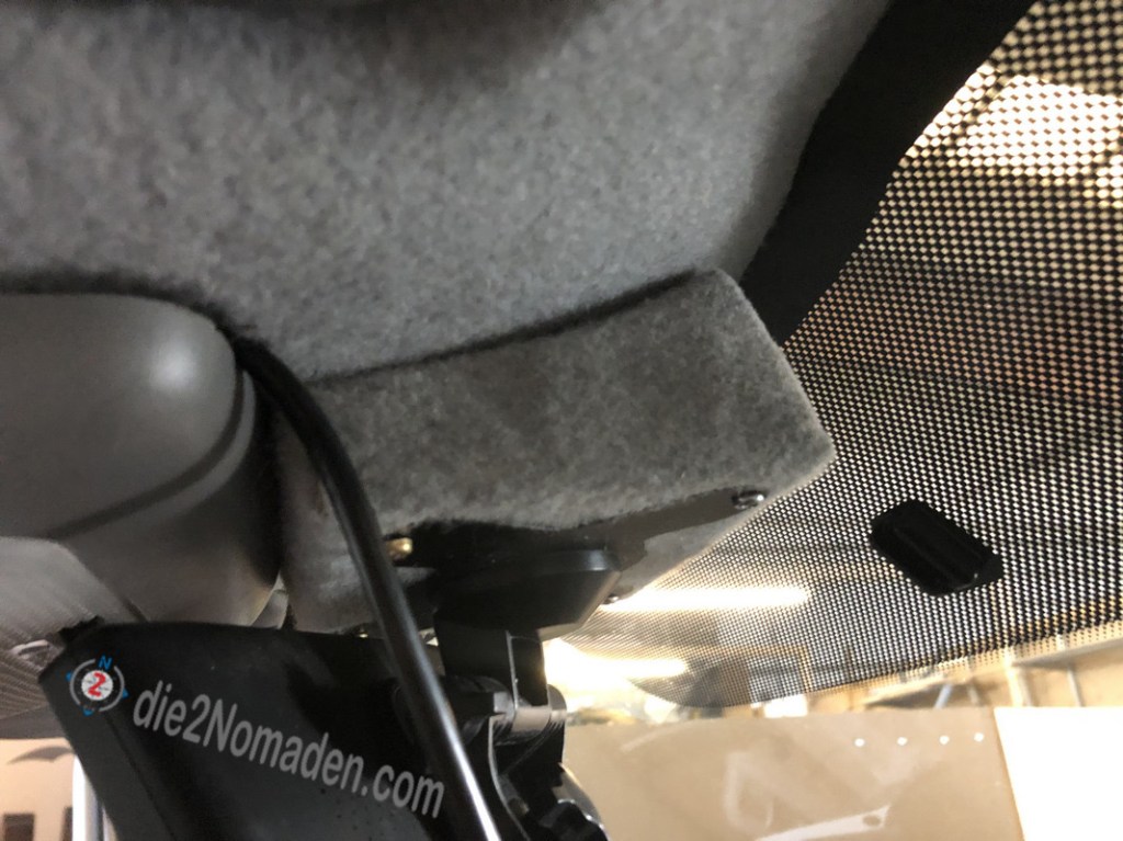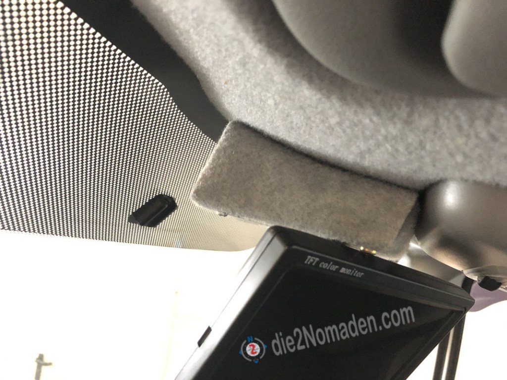 Als Abhilfe haben wir nun einen schrägen Montagesockel gebaut, diesen überkopf an das Ablagefach anstelle eines Rückspiegels montiert und darauf wieder den Monitor befestigt.