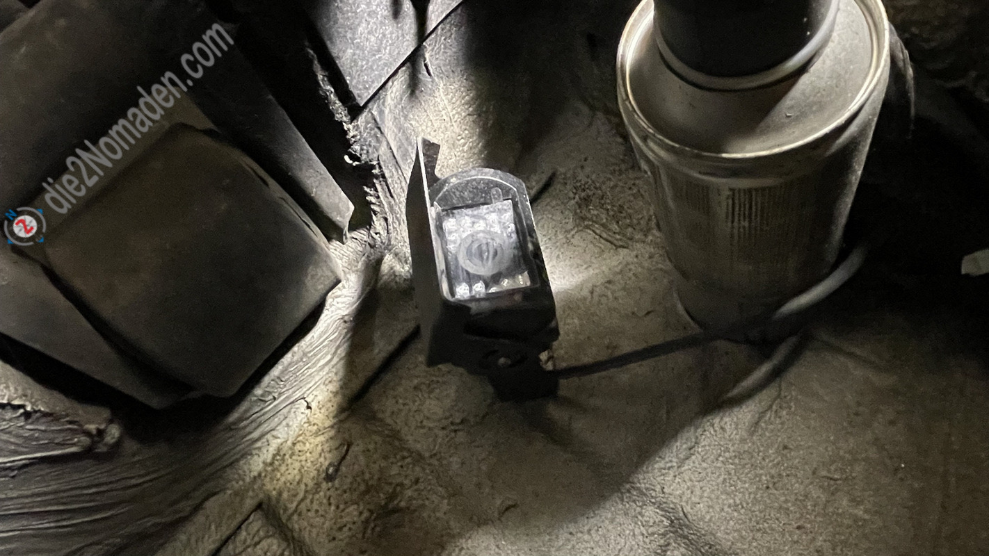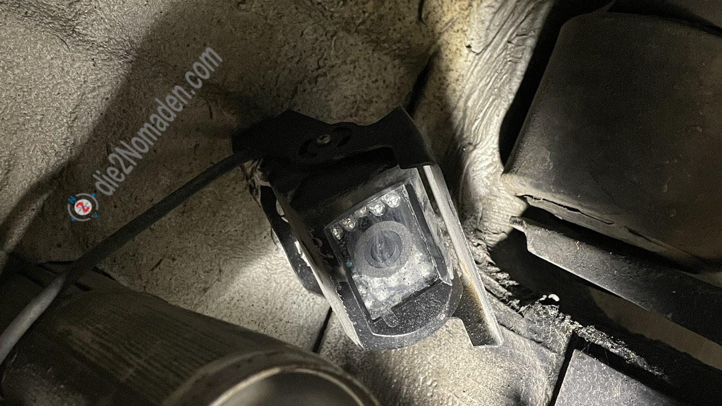 Eine andere Kamera haben wir beim Auslassrohr des Abwassertanks so montiert, dass wir in der Fahrerkabine sitzend den Abwassereinlass im Boden sehen können.