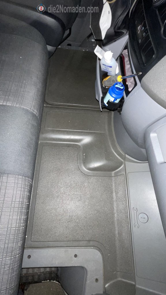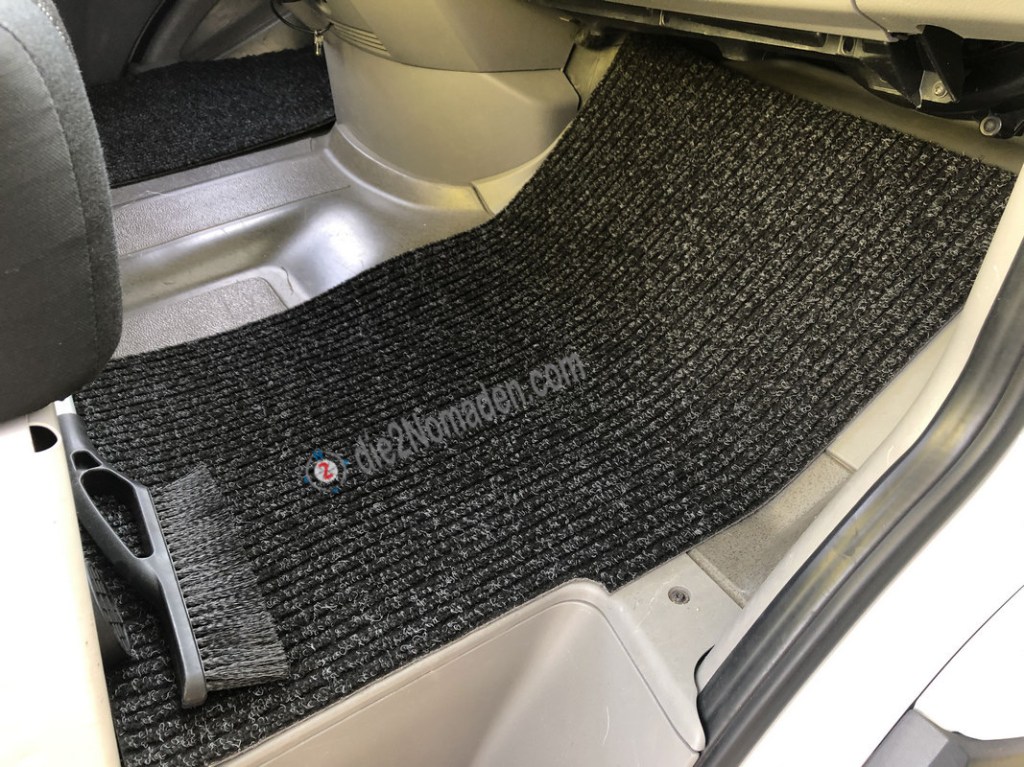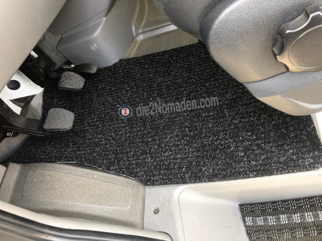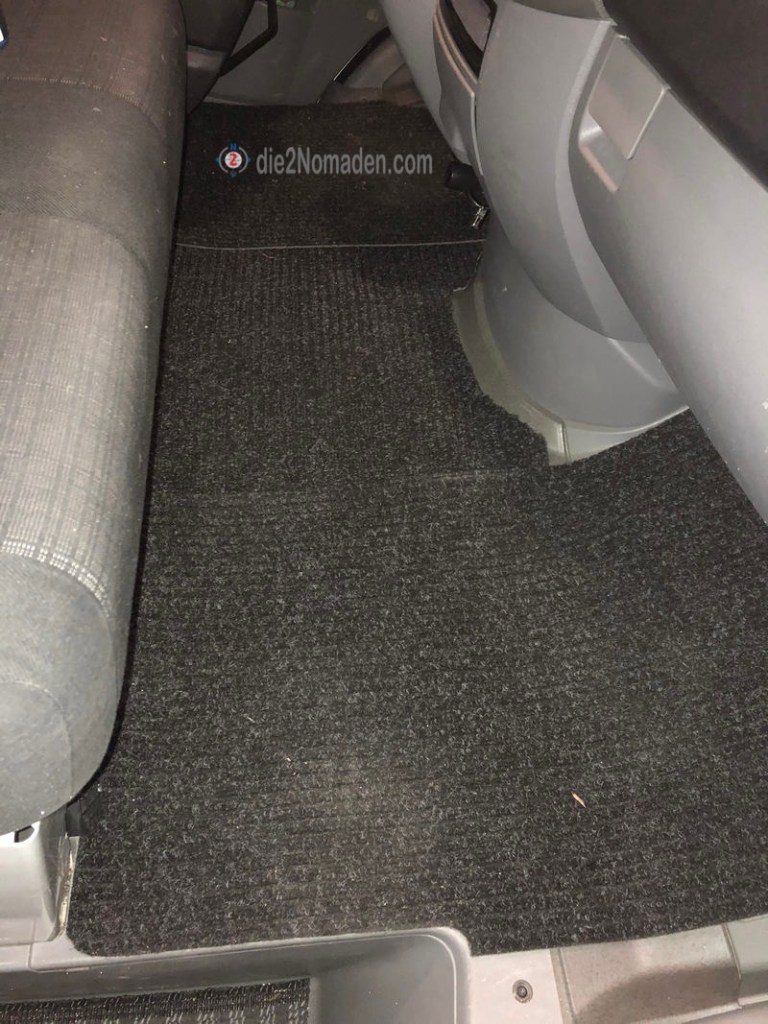 Wir besorgen uns im Baumarkt 3 Stück dünne, grau melierte Fußabstreifer, die wir so zuschneiden, dass die perfekt in den Fußraum passen.
