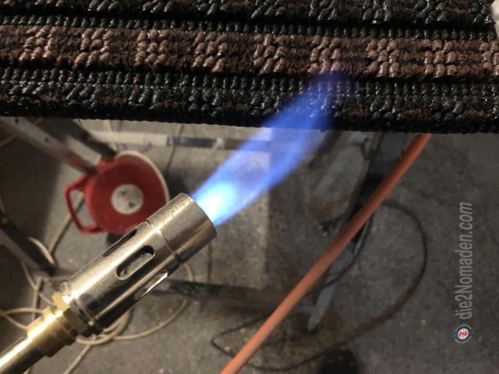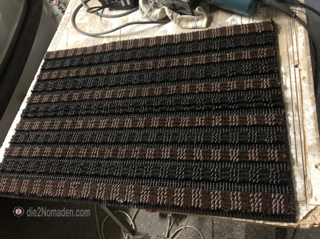 Zwei weitere Fußabstreifer gleicher Art, dieses Mal in unterschiedlichen Brauntönen, wurden ebenfalls angepasst. Alle Schnittstellen haben wir mit einem Bunsenbrenner verödet, damit die Fäden sich nicht weiter auflösen.