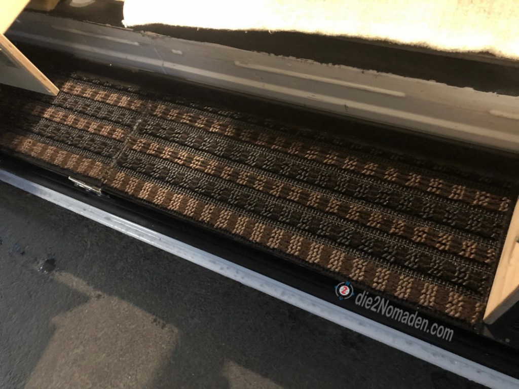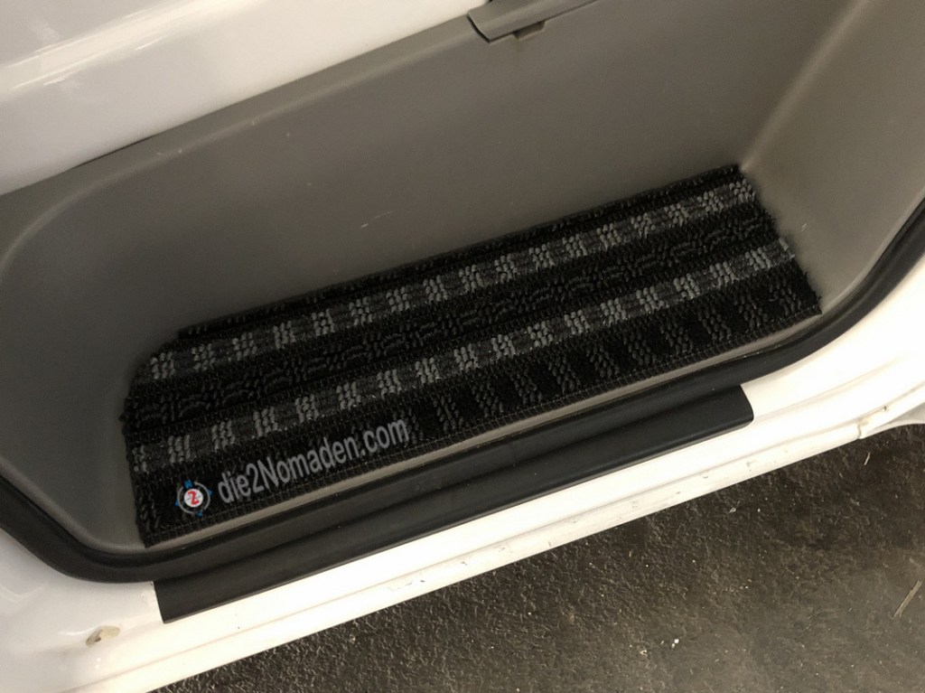 Ein anderer, etwas gröberer Fußabstreifer in grau wird in die Trittstufe der Fahrer- sowie in der Beifahrertüre eingepasst.