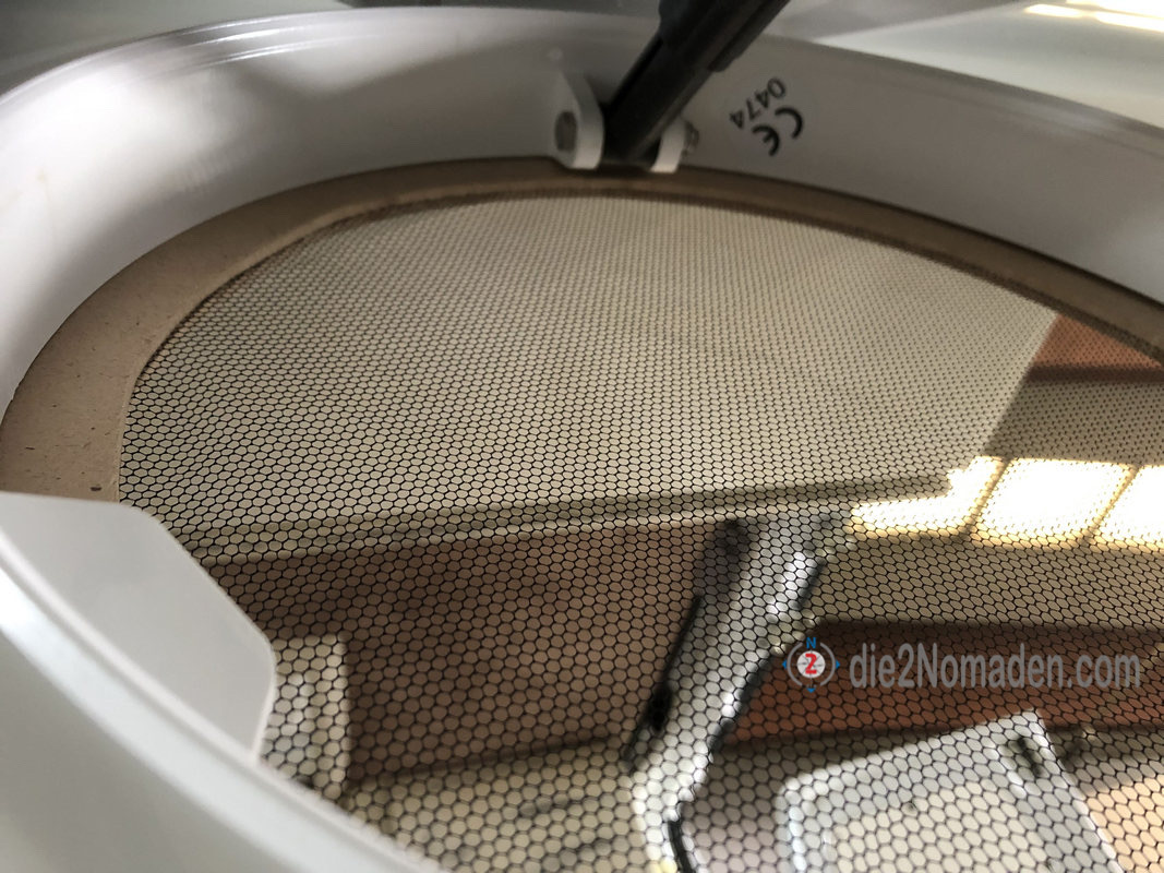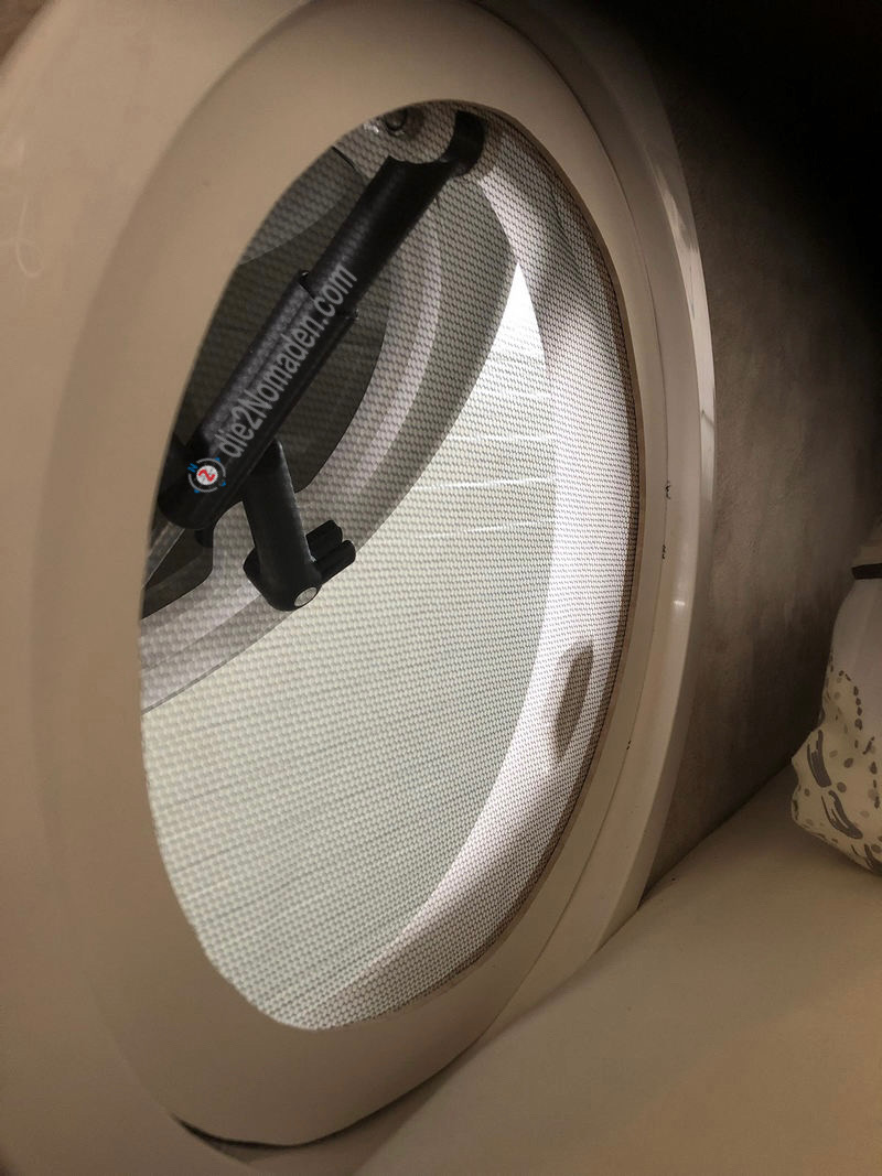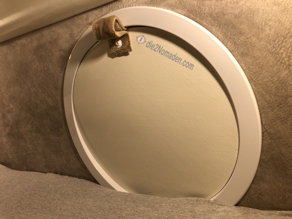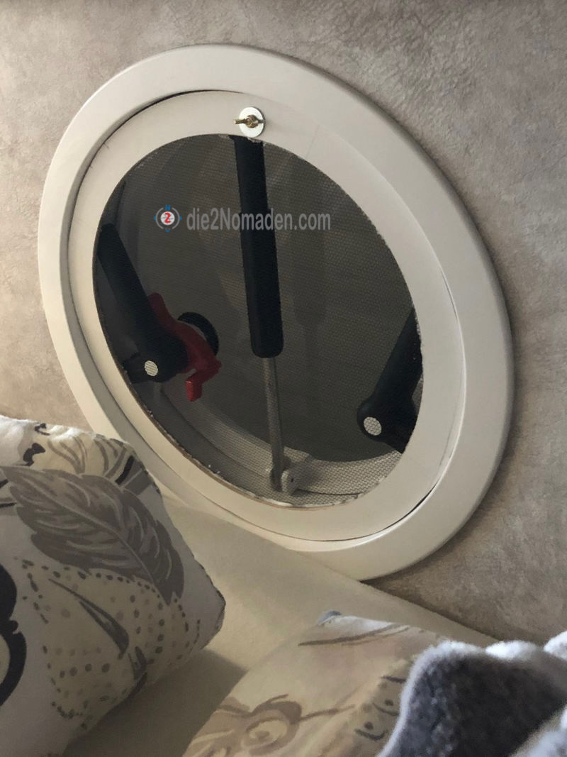 Wir sind ausgesprochen froh, dass wir im Schlafbereich Bullaugen eingebaut haben. Doch für diese Art von Fenster gibt es leider keinen Verdunklungs- bzw. Insektenschutz.