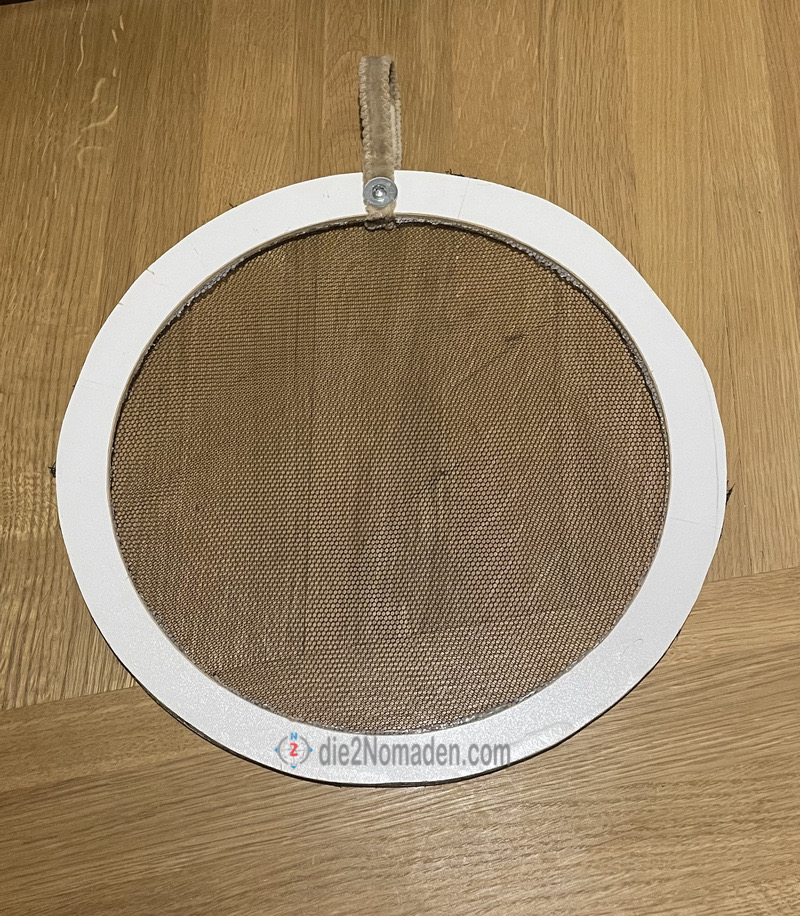 Dazu haben wir in der gleichen Größe einen Ring aus Buchenholz mit 3 mm Stärke ausgeschnitten und weiß lackiert. Nun haben wir zwischen den beiden Ringen ein Fliegengitter eingeklebt und alle miteinander verleimt.