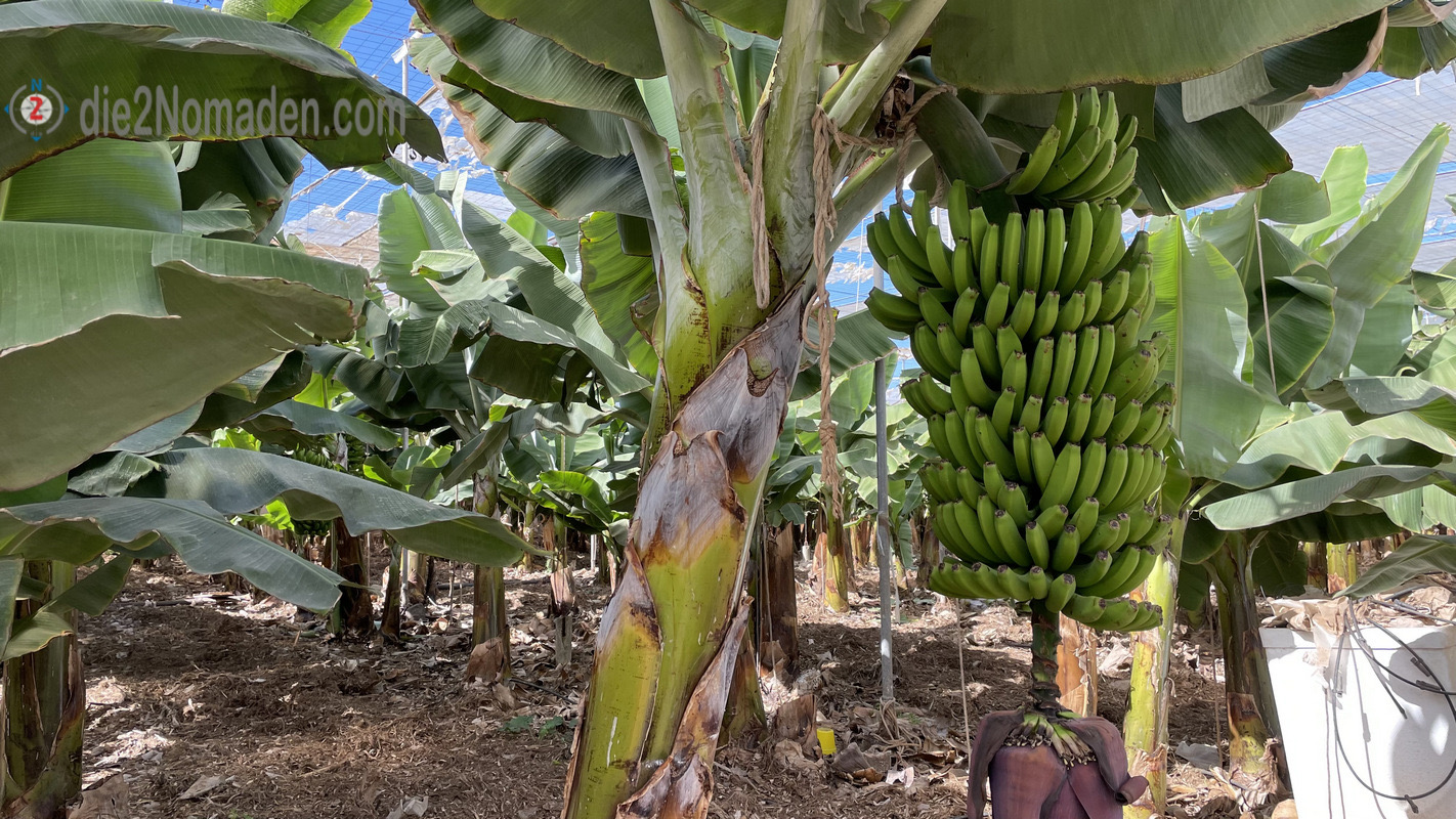 Entlang dieser Tour kommen wir an unzähligen Bananenplantagen vorbei. In eine dieser Plantagen durften wir dank eines sehr netten Spaniers einen Blick werfen. Er war sichtlich amüsiert über unsere Freude, in eine dieser verhüllten Bananenplantagen eintreten und fotografieren zu dürfen. Gracias Senor.