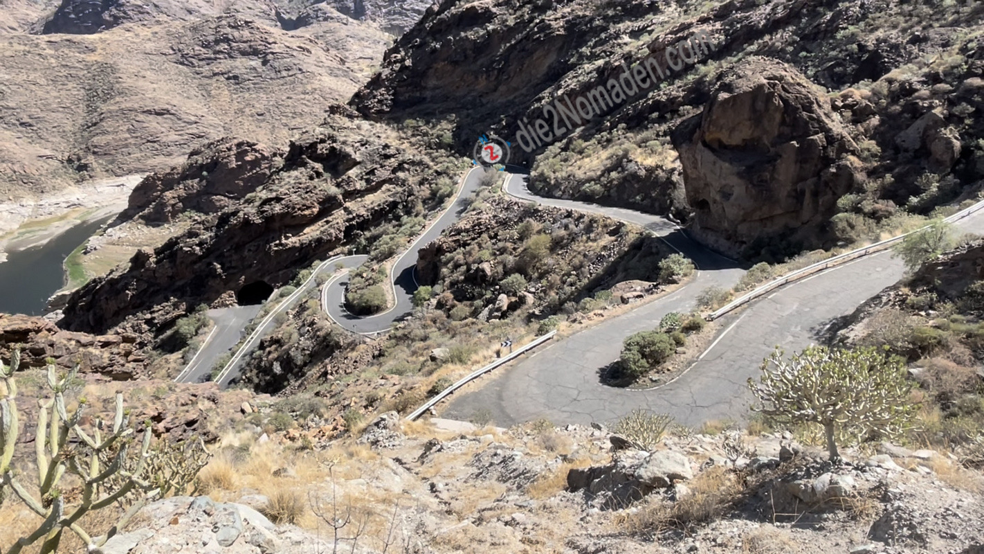 Gefühlte 100.000 Kurven auf dieser landschaftlich einzigartigen, schmalen und abenteuerlichen kleinen Verbindungsstraße „GC606“ von La Aldea über Carrizal de Tejeda und El Toscon bis zum Pico de Las Nieves im Zentrum der Insel, lassen sowohl Träume (Andre) als auch Albträume (Uli) wahr werden. Ich genieße die Fahrt in vollen Zügen und Uli … tja, die möchte manches Mal am liebsten aussteigen und zu Fuß weitergehen. Diese schmale ungesicherte Straße mit seitlichen Abgründen muss man mögen. Die vielen Radfahrer hier tun es definitiv und plagen sich Kurve um Kurve hinauf.