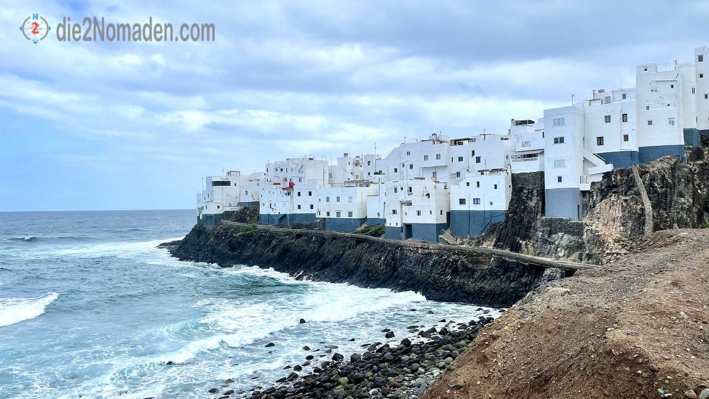 Daher nehmen wir nun Kurs entlang der Küstenstraße nach Moya. Hier möchten wir El Roque besuchen, das weiße Felsendorf auf einer Landzunge, welche ins Meer ragt. Vorher spazieren wir im kleinen Örtchen kurz vor El Roque herum, bewundern die bunten sturmerprobten Fischerhäuser – es gibt hier sogar goldene Türen und Fensterläden – und filmen und fotografieren das stürmische Meer, das durch die schäumende Gischt fast einen Nebel erzeugt.