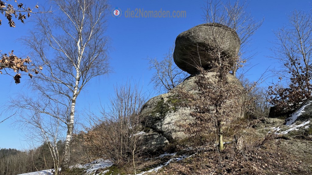 Nach ein paar Aufnahmen wandern wir auf der Straße weiter bis zur Kreuzung. Wir gehen links und umrunden den Bauernhof. Ab hier ist der Elefantenstein bereits zu sehen. Es handelt sich hiermit um übereinander liegende Granitblöcke. Diese Aufschlichtung und die starke Verwitterung der Steine verleihen das Aussehen der Vorderansicht eines Elefanten.