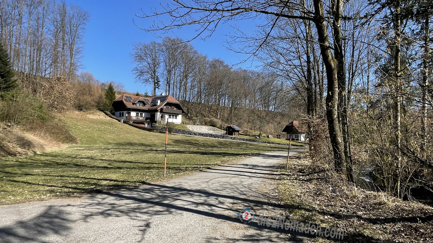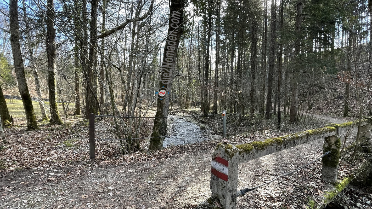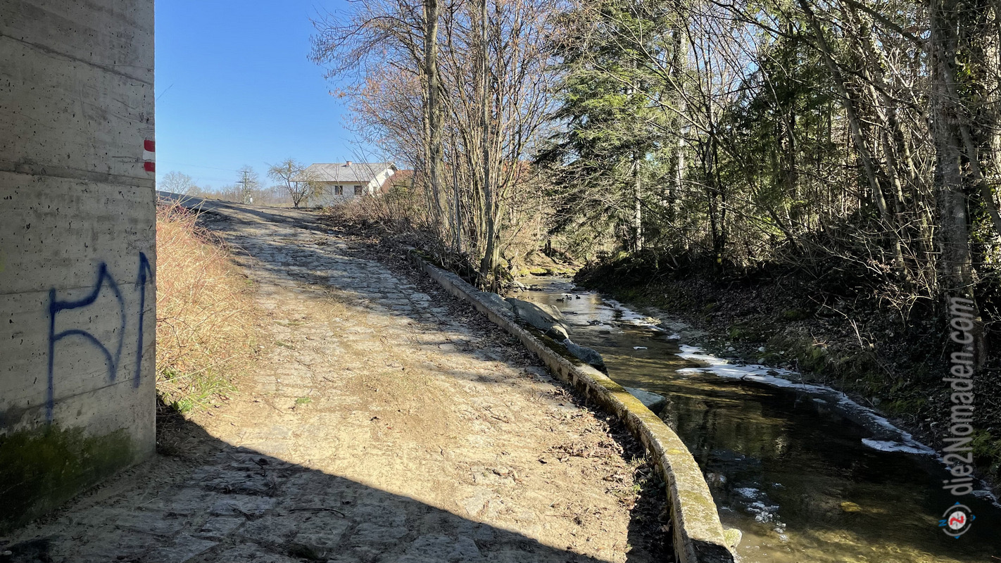 Dann geht es auch schon wieder weiter. Hinunter zum Waldrand, über die Straße und hinein in ein Waldstück. Hier ist der Faller Wasserfall schon mit 30 Minuten beschrieben und wir rätseln von der Ferne, wo hier wohl ein Wasserfall sein sollte. Entlang geht es über eine alte kleine Bücke und auf einem schmalen Weg entlang des Schädelbaches, der teilweise noch gefroren ist, vorbei an ein paar wunderschön gelegenen Häusern in toller Alleinlage bis wir die Unterführung erreichen, wo es zum Wasserfall gehen soll.