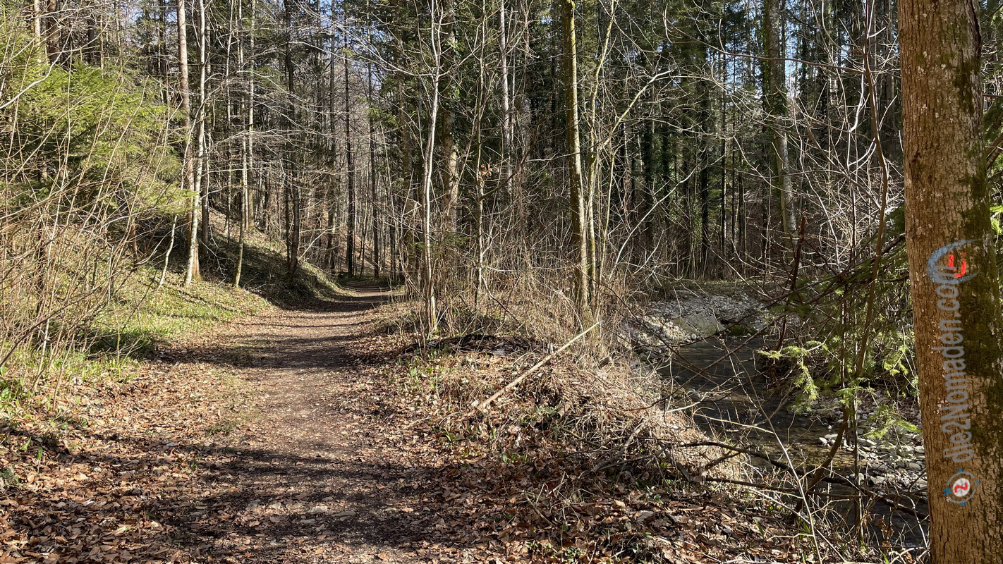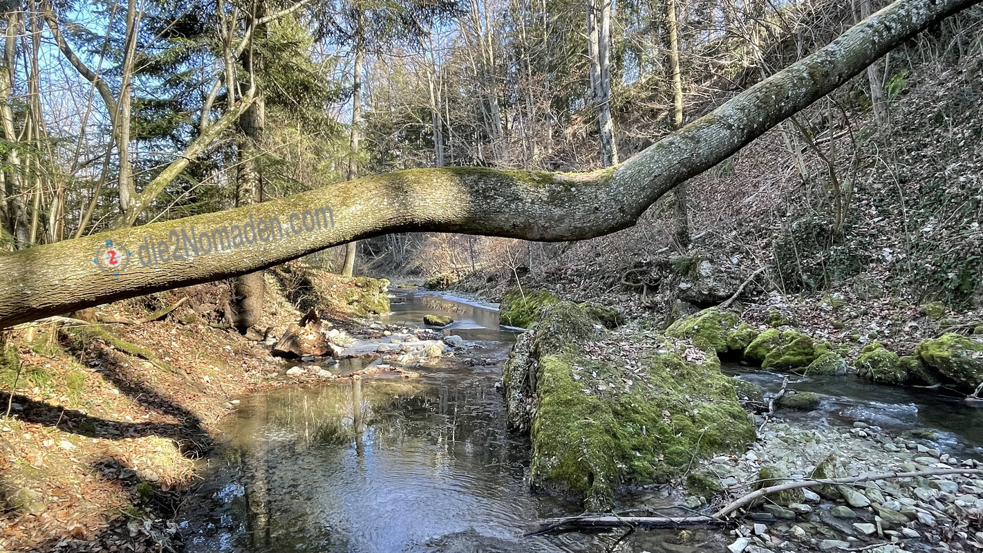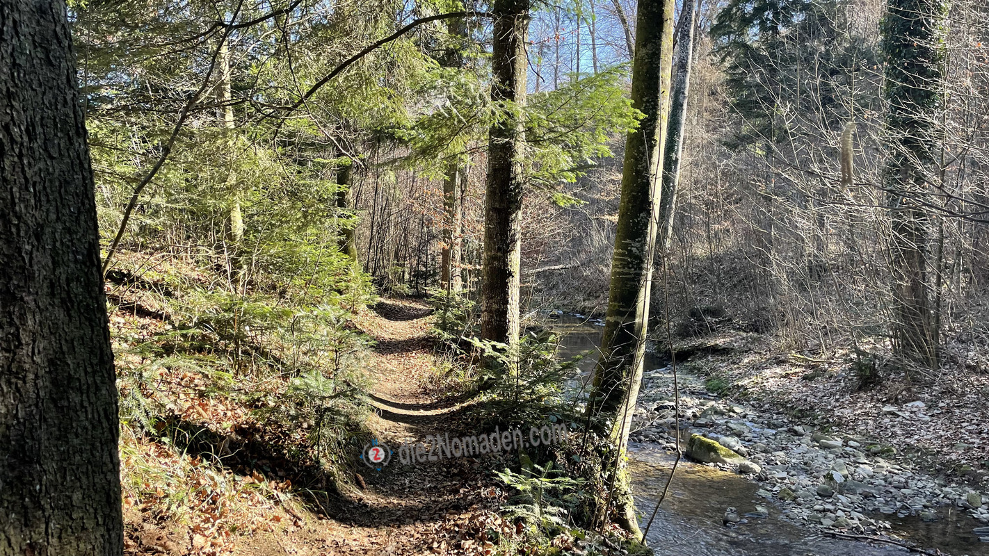 Dann geht es auch schon wieder weiter. Hinunter zum Waldrand, über die Straße und hinein in ein Waldstück. Hier ist der Faller Wasserfall schon mit 30 Minuten beschrieben und wir rätseln von der Ferne, wo hier wohl ein Wasserfall sein sollte. Entlang geht es über eine alte kleine Bücke und auf einem schmalen Weg entlang des Schädelbaches, der teilweise noch gefroren ist, vorbei an ein paar wunderschön gelegenen Häusern in toller Alleinlage bis wir die Unterführung erreichen, wo es zum Wasserfall gehen soll.