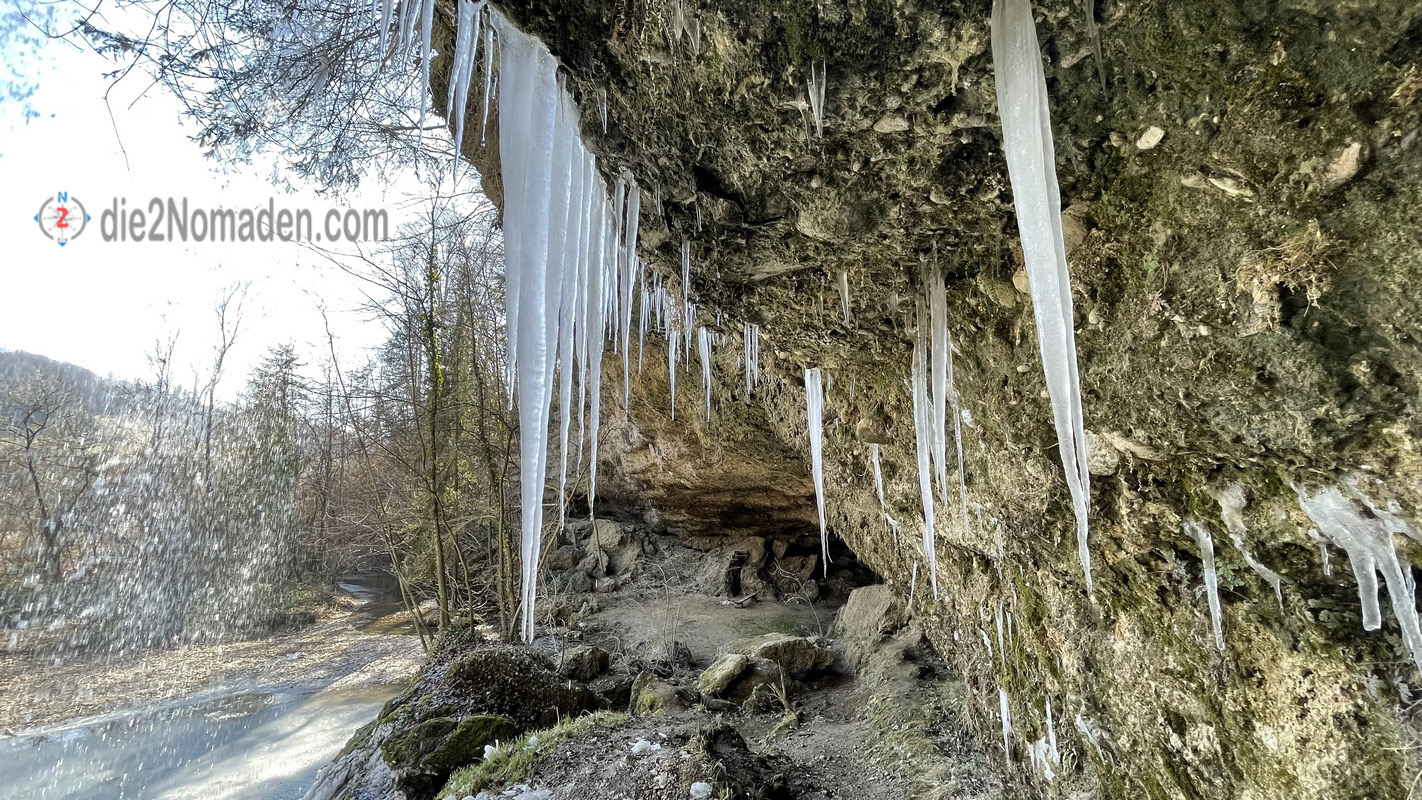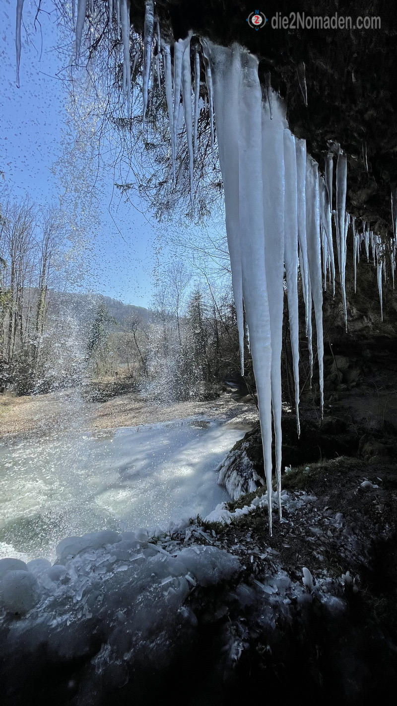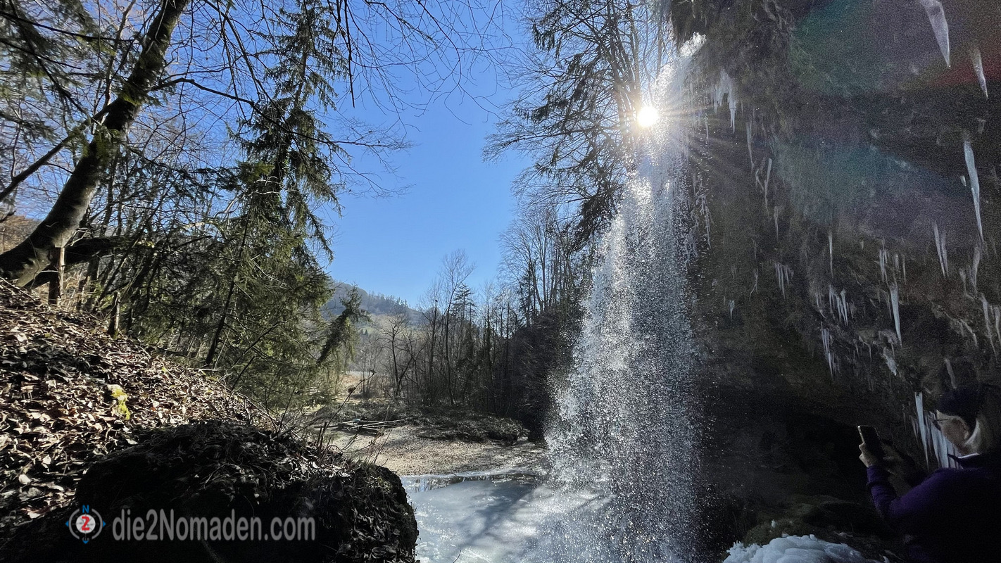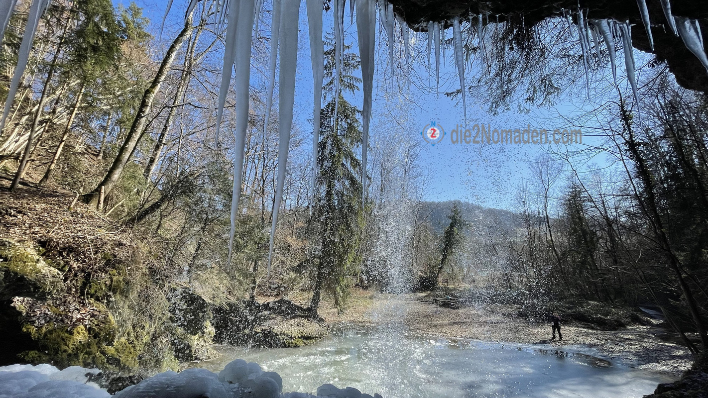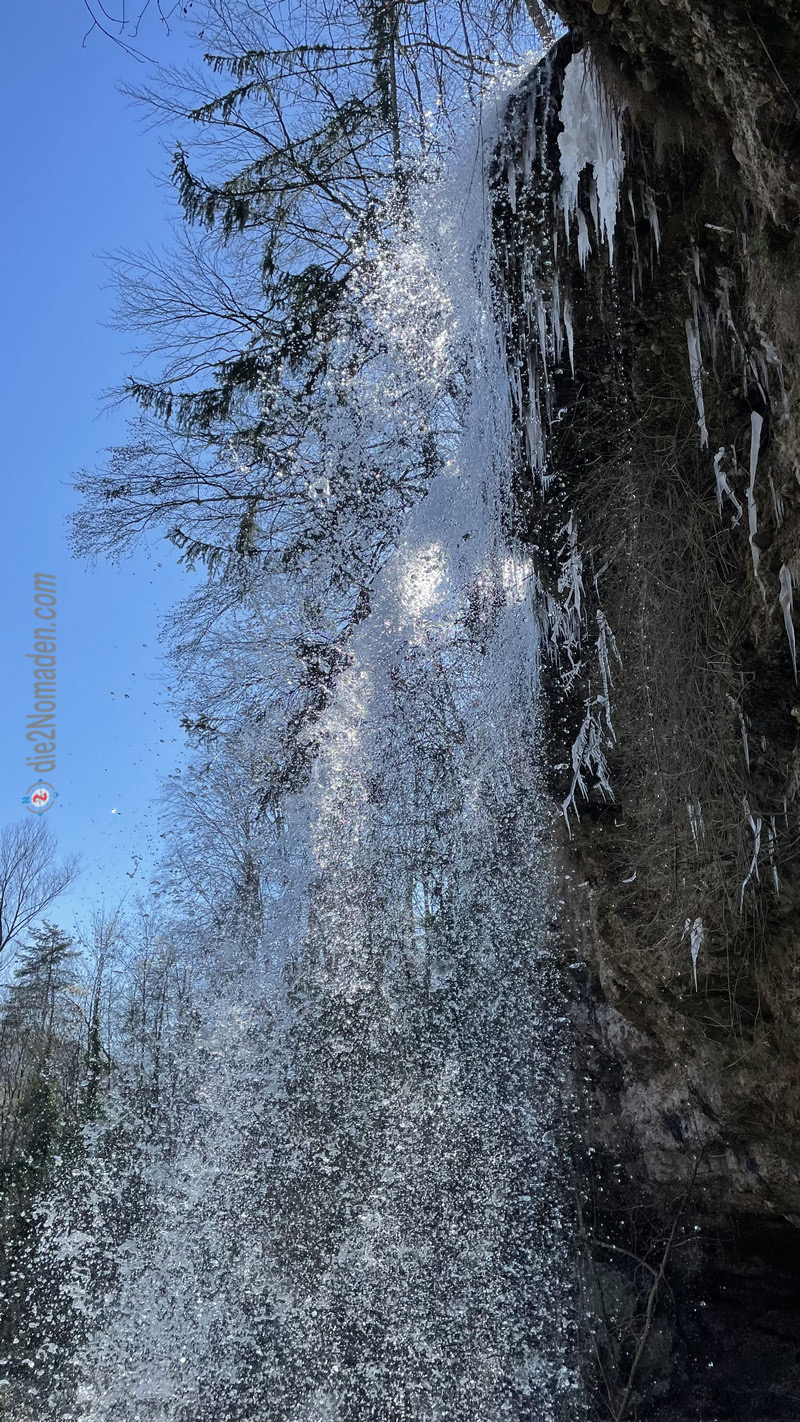 Unter dem Wasserfall hat sich aufgrund der Nachtfröste noch das Eis gehalten und lange Eiszapfen hängen von der Wand hinter dem Wasserfall, hinter den man ganz leicht gehen kann – bissl aufpassen, eh klar, es rutscht. Ach ja … von oben könnten Eiszapfen einschlagen.