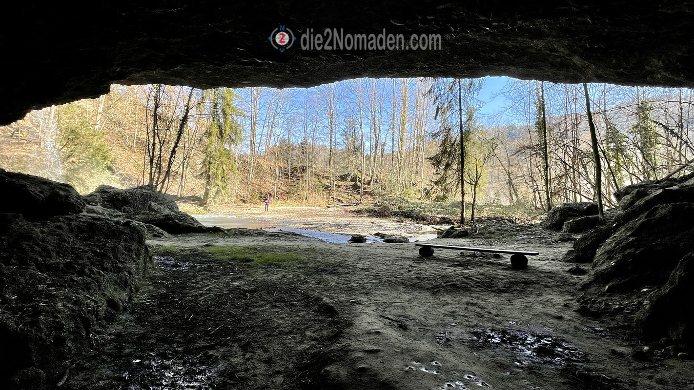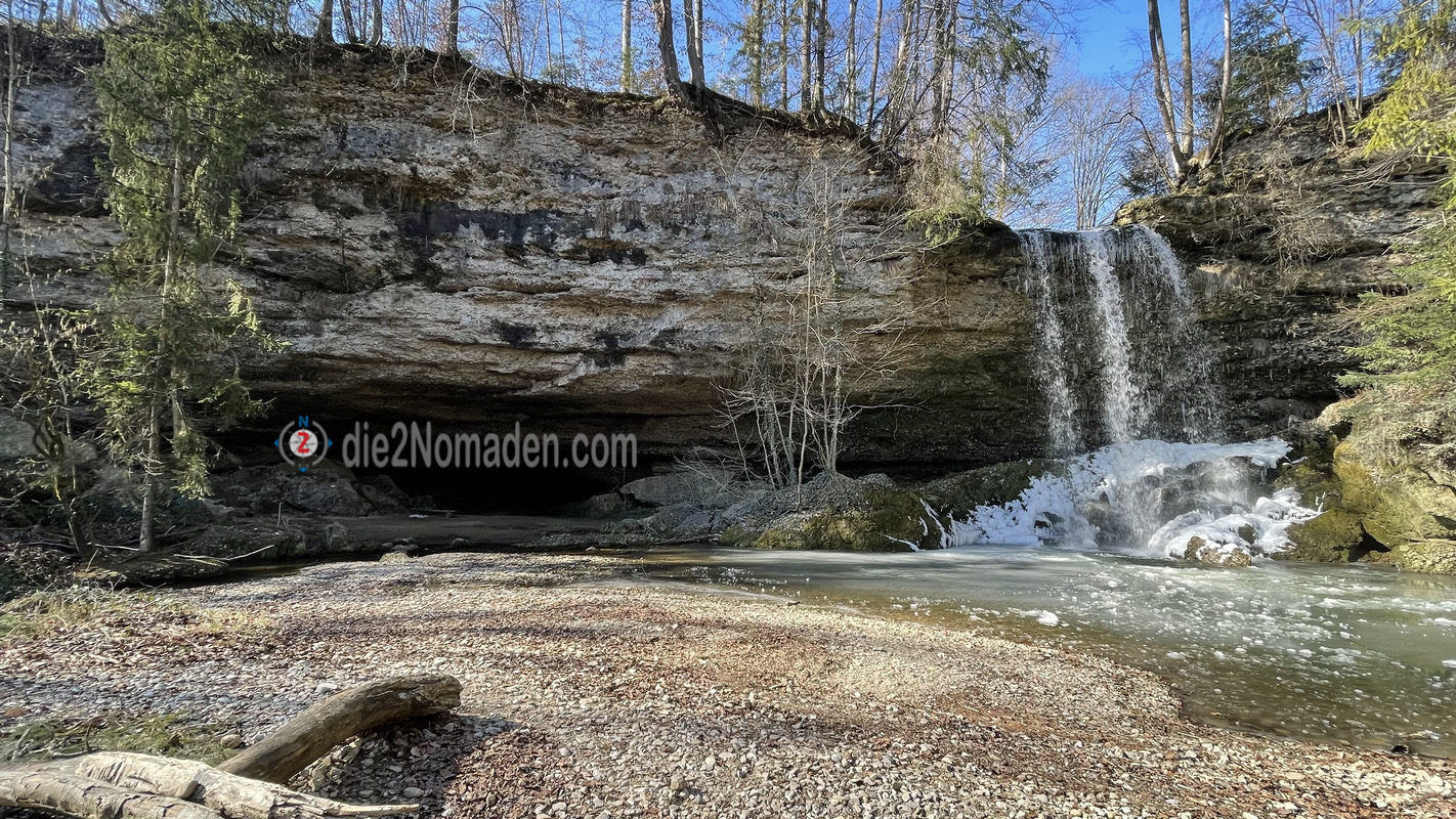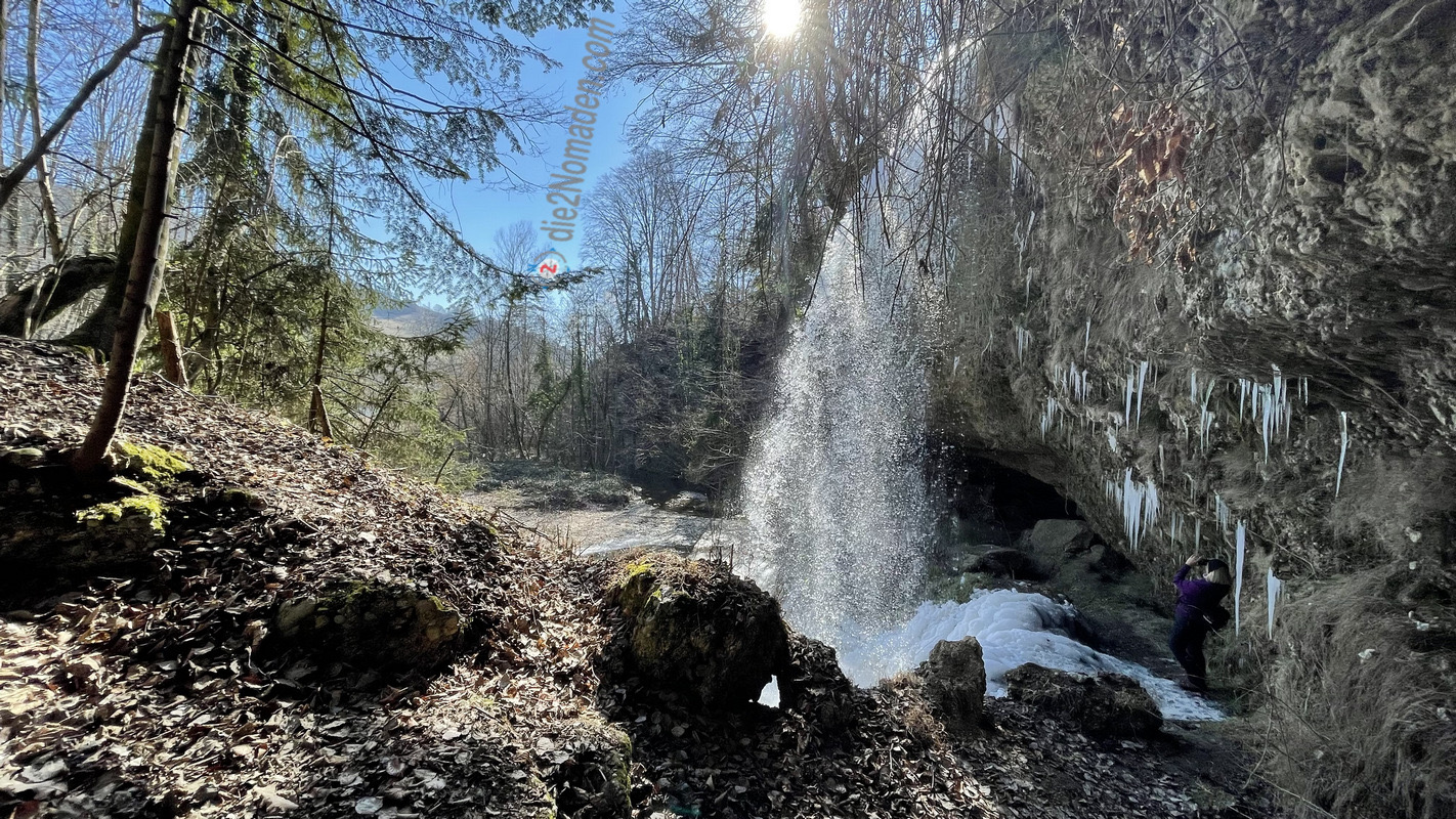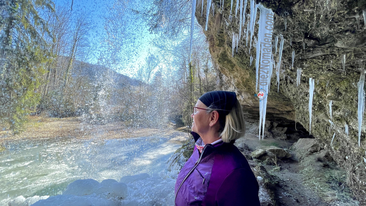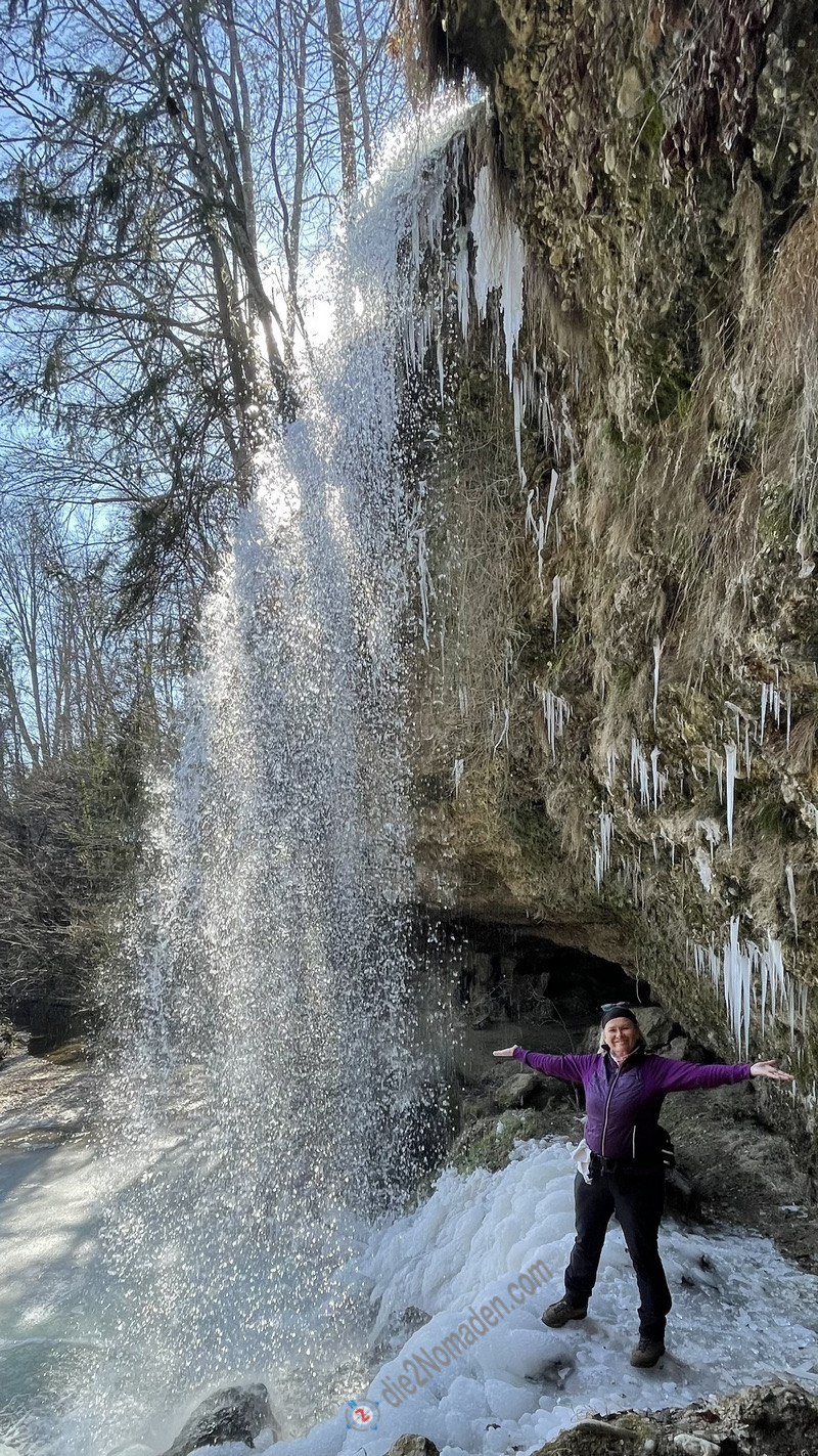 Unter dem Wasserfall hat sich aufgrund der Nachtfröste noch das Eis gehalten und lange Eiszapfen hängen von der Wand hinter dem Wasserfall, hinter den man ganz leicht gehen kann – bissl aufpassen, eh klar, es rutscht. Ach ja … von oben könnten Eiszapfen einschlagen.