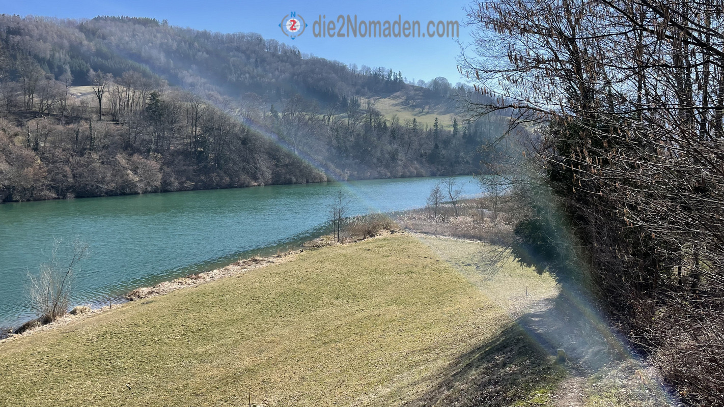 Nachdem hier auch schon der Faller Wasserfall angeschrieben ist, machen wir eine kurze Rast in der Sonne auf der Türschwelle des Wasserspeichers Ternberg mit herrlichem Rundblick und genießen einen saftigen Apfel.