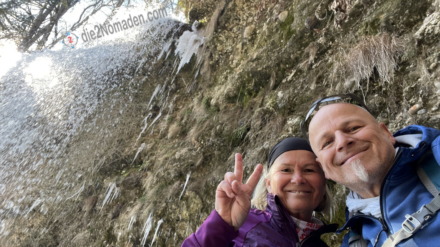 Wir können unser Glück nicht fassen, so etwas Schönes entdeckt zu haben und staunen, knipsen und filmen – wahrscheinlich jeden einzelnen Wassertropfen und Eiszapfen.