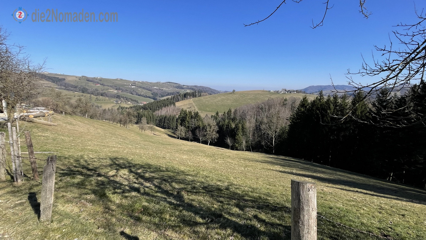 Eine Straße durch ein kleines Siedlungsgebiet, vorbei beziehungsweise eigentlich gleich durch das Gehöft eines Bauernhofes und wir wandern schon auf lieblichen Forst- und Güterwegen im strahlenden Sonnenschein.