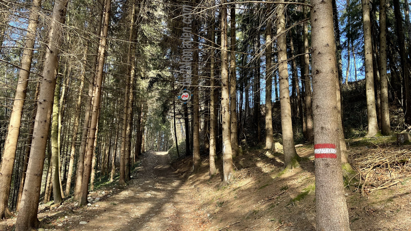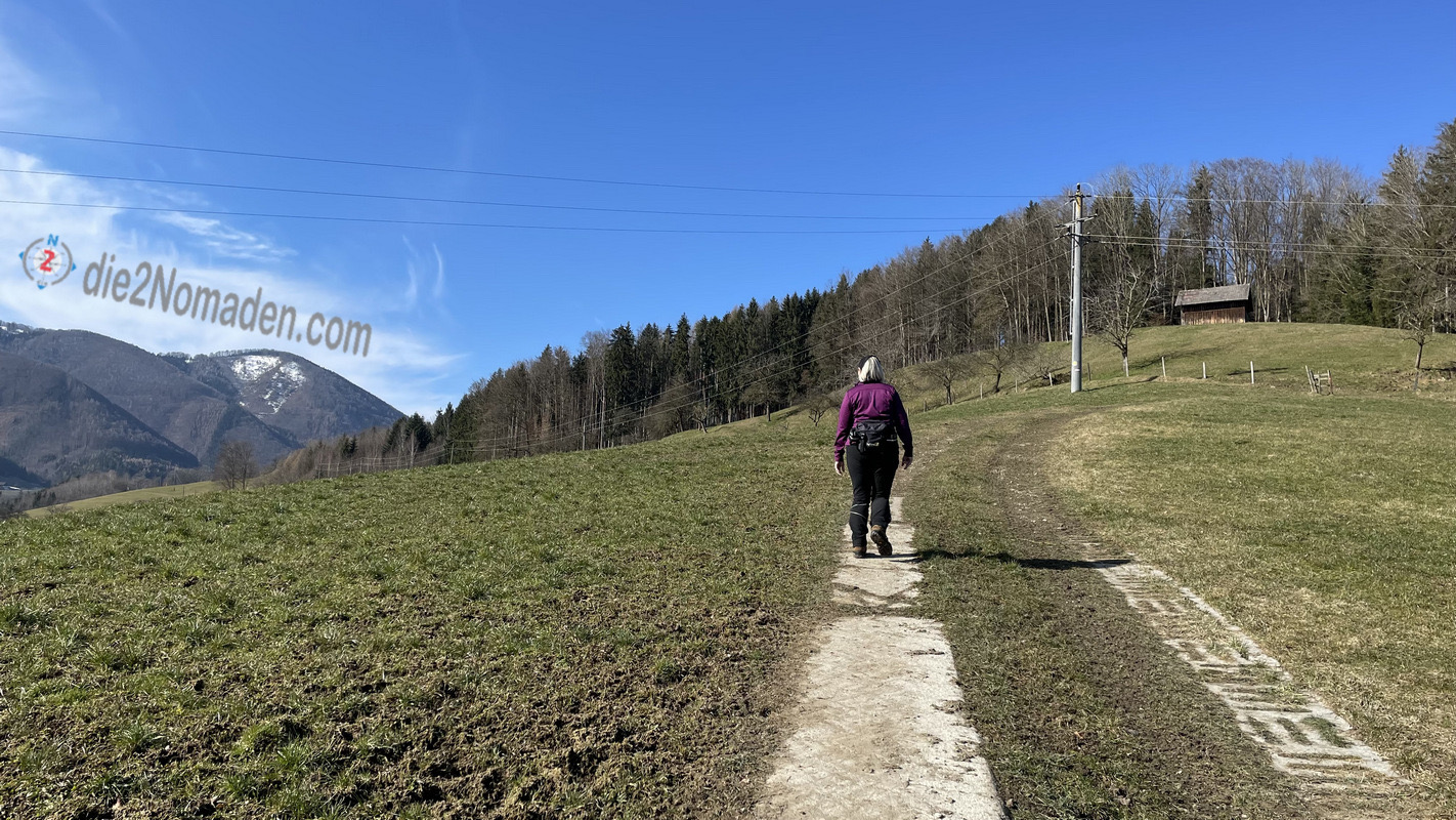 Aber nachdem wir ja die ungefähre Richtung wissen, finden wir ein wenig oberhalb bald wieder eine rot-weiß-rote Wandermarkierung und schon sind wir wieder on Tour … jedoch nicht für lange.