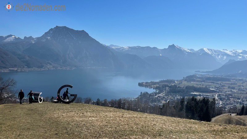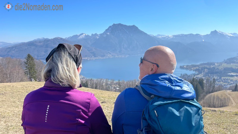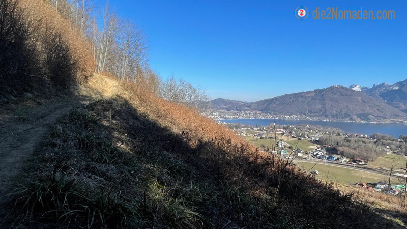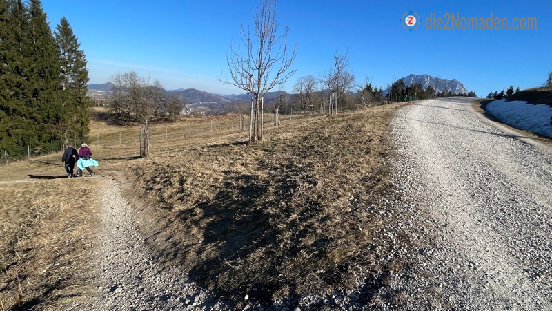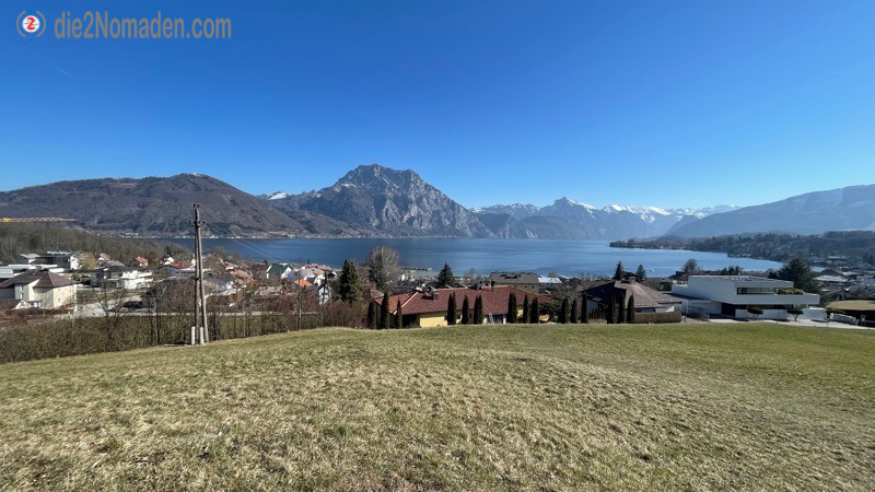 Die grandiose Aussicht von hier heroben auf den Traunsee entschädigt definitiv alle Strapazen und schließlich erreichen wir wieder die Straße über der Streuobstwiese, die unseren Rundweg beschließt. Von hier geht es wieder bergab – den selben Weg, den wir vorher bergan marschiert sind, bis wir schließlich den Parkplatz in Pinsdorf erreichen.
