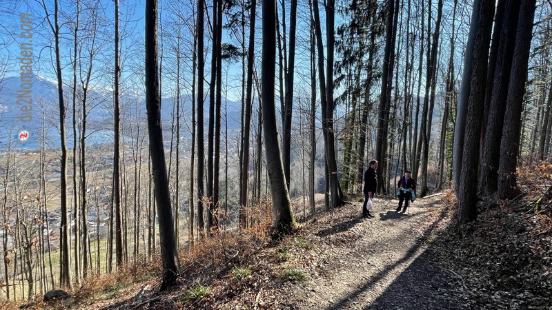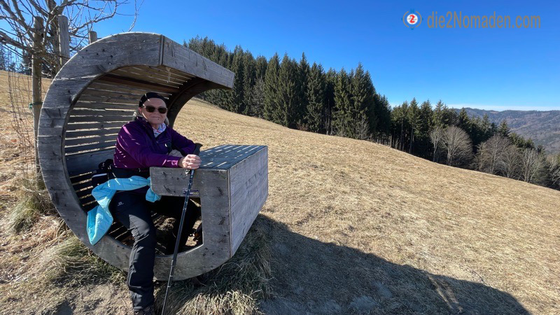 Ab hier ist die Straße zu Ende und ein Wanderweg durch ein Waldstück führt uns hinauf zu einer riesigen Streuobstwiese. Hier gibt es die Möglichkeit zu rasten und die Aussicht ins Land hinein zu genießen.