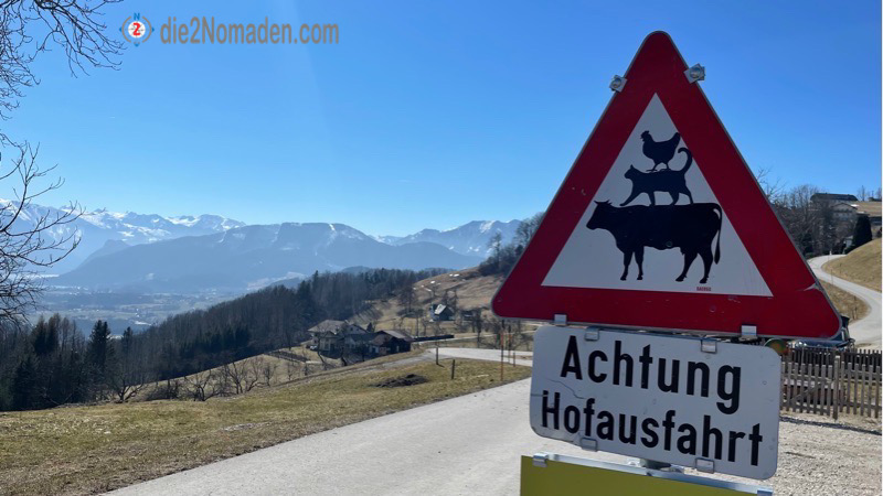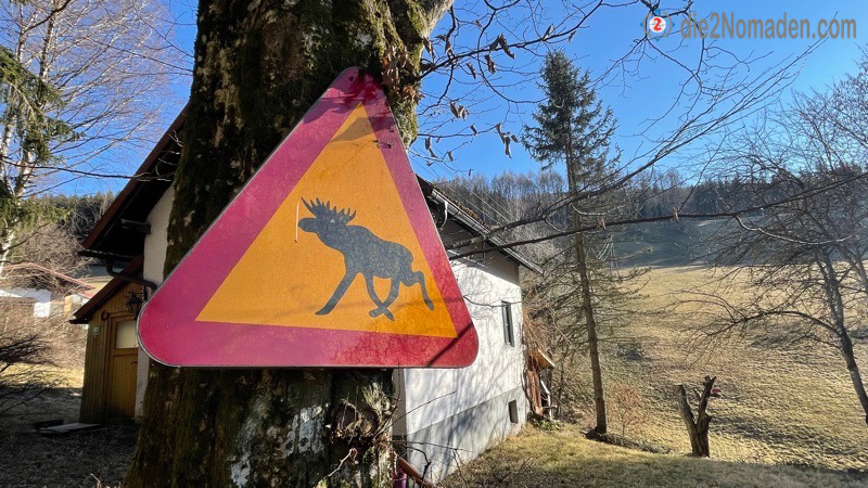 Die Straße führt uns immer weiter bergwärts und wir folgen schließlich links dem Wegweiser „Gmundnerberg über Wanderweg“. Anscheinend gibt’s zu unserer Belustigung hier auch Elche, die die Straße queren.