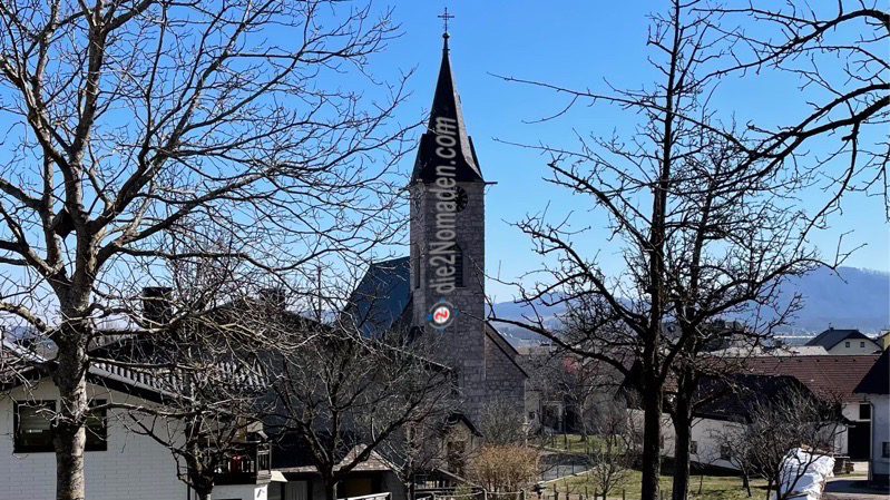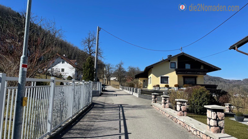 Nach der Kirche führt ein schmale Wanderweg stetig aufwärts durch eine Siedlung mit sehr gepflegten schönen Häusern und Gärten, wo überall fleißig gewerkelt wird, bis wir auf eine Straße einmünden, wo es ebenso Parkmöglichkeiten gäbe (bitte nicht die Parkplätze der Häuser an der Straße benutzen, es gibt hier eigene für Wanderer).