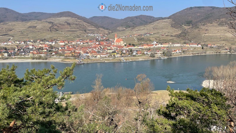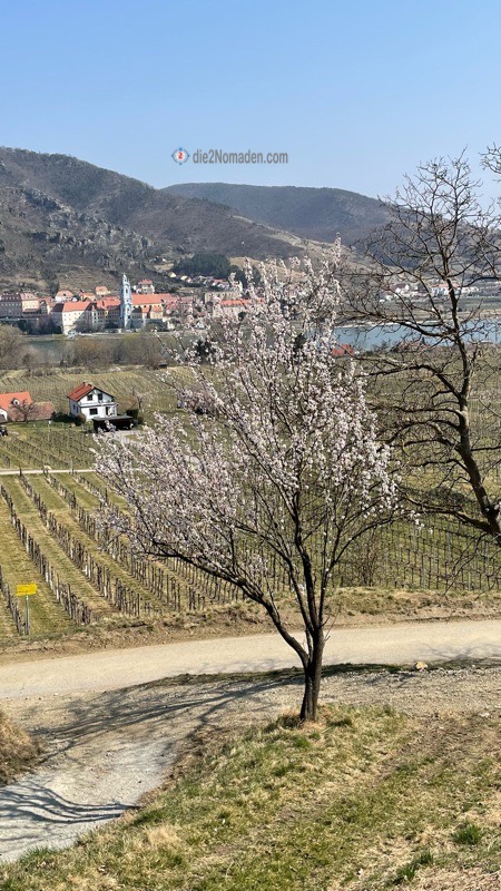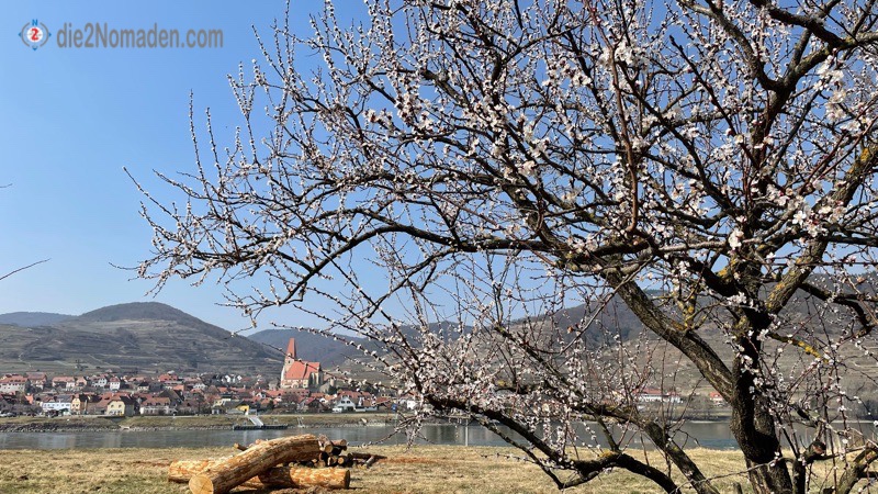 Den Parkplatz schon fast in Sichtweite, locken uns noch ein paar wunderschön erblühte Marillenbäume, an denen wir natürlich nicht einfach so vorbei gehen. Nein, noch ein paar Fotos von diesen und Weißenkirchen im Hintergrund und dann erreichen wir unseren Parkplatz.