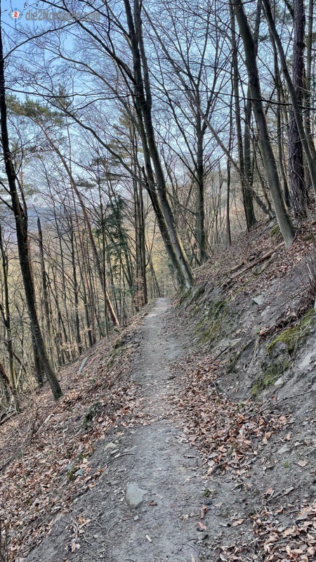 Gleich gegenüber der Einfahrt zum Fähranleger geht der Wanderweg kurz über einen Wiesen- und dann in einen Waldweg über, dem wir in Serpentinen stetig bergan folgen. Bissl aufpassen heißt es, weil es da so trocken ist und die Blätter des Herbstes eine Rutschpartie auf dem schmalen Weg sein können.