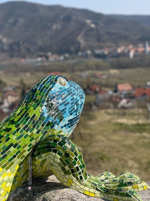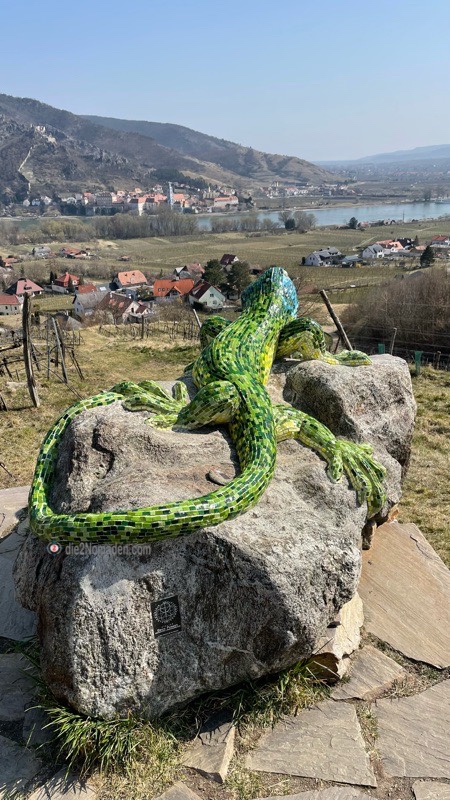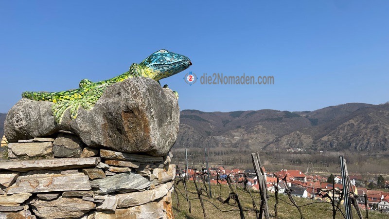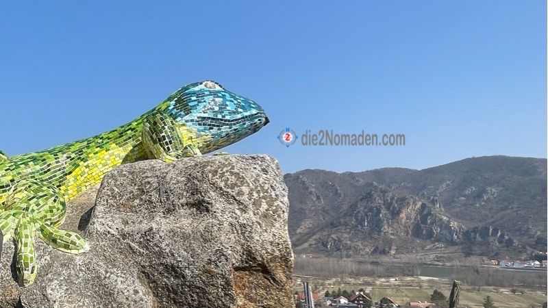 Noch ein kurzes Stück und wir erreichen das Etappenziel – die Smaragdeidechse. Eine riesige Echse aus Kunststein und Muranoglas, von einem Künstler erschaffen. Sie liegt dort auf einem großen Stein und blickt auf Rossatz, die Donau und bis hinüber nach Dürnstein. Ein Schmuckstück im wahrsten Sinne des Wortes. Auch dort gibt es gemütliche Bankerl und Sonnenliegen und man kann die Seele baumeln lassen.
