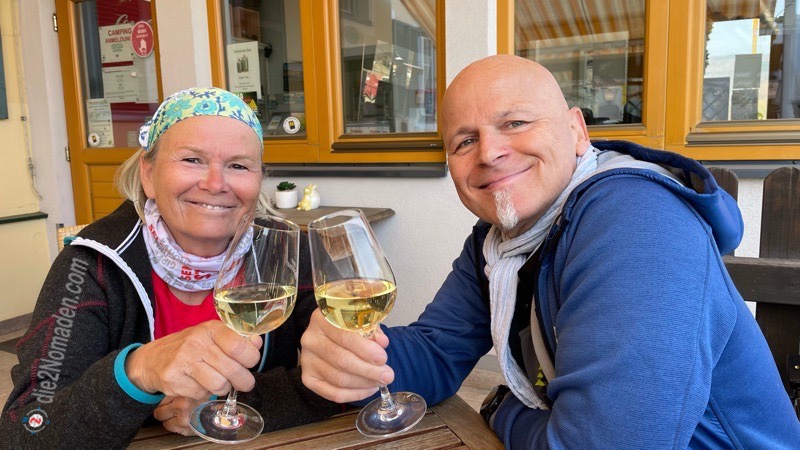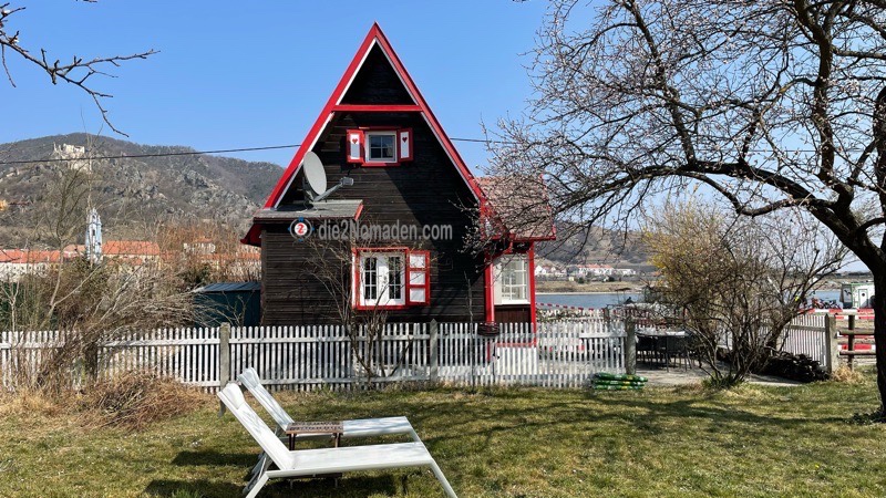 Hier sind wir erstmal baff, weil der Campingplatz nicht mehr existiert. Aufgrund des Baues der Hochwasserschutzwände ist dieser heuer ganz sicher nicht mehr anzufahren. Aber das Wirtshaus „Alte Schiffstation“ gibt es noch. Die wirklich sehr nette Kellnerin stillt unseren Wunsch nach einem wunderbaren Wachauer Achterl Wein und einem Glas Wasser und zufrieden setzen wir nach einer kleinen Pause unseren Weg fort.