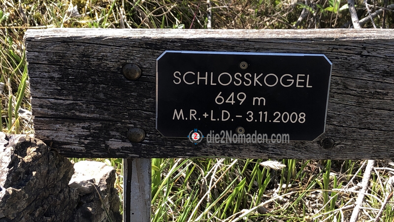 Ein paar Klettereien später erreiche ich ein kleines Bankerl am Schlosskogel auf 649m Seehöhe. Die Aussicht ist traumhaft hier heroben, doch seitlich geht eine kleiner Weg weiter vorbei, dem ich folge.