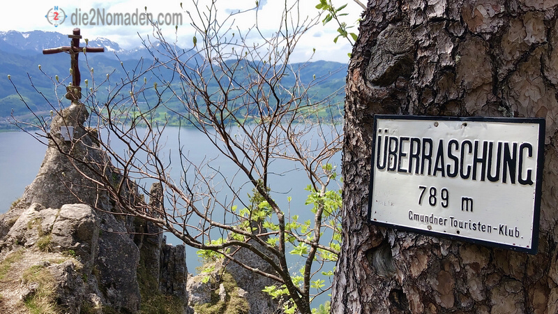 Man erreicht die Anhöhe und sieht rechts den Kamm entlang und erblickt ein Gipfelkreuz, sowie den Traunsee unterhalb … einfach verblüffend.