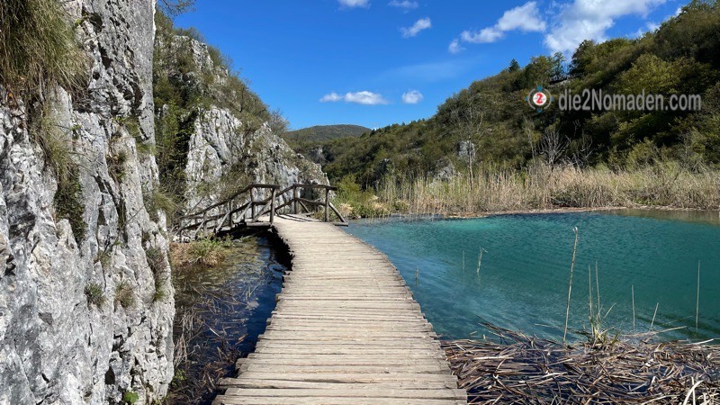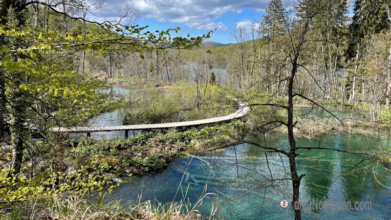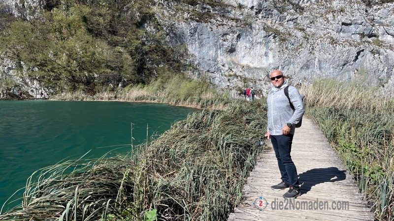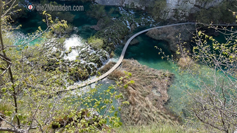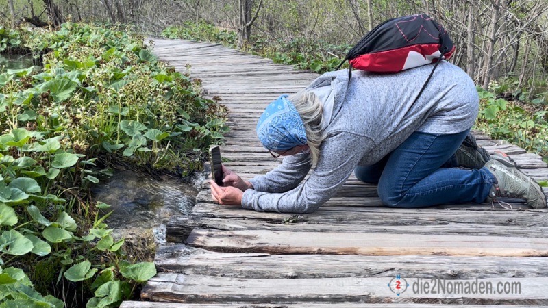 Anscheinend soll es hier in der Hauptsaison überall zum Anstellen sein und die Holzstege auf den Seen gestopft voll mit Besuchern – bei uns sind 3 Personen vor uns an der Kasse und das war es dann auch schon mit Anstellen – nirgendwo mehr. Und so suchen wir uns am Plan unsere Route, von denen es sehr viele Möglichkeiten gibt – je nach Lust und Laune – und marschieren los. Nur ein paar Meter erst einmal und dann geht das Staunen und Fotografieren auch schon los.