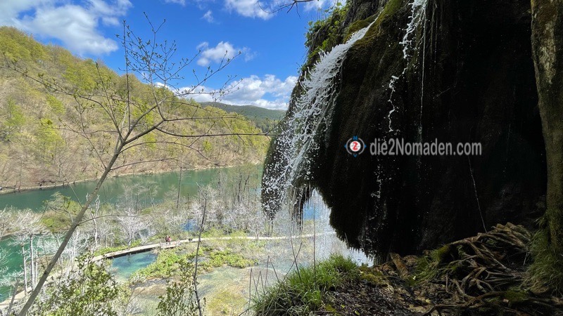 Die Sonne scheint und wir wandern, teilweise ganz alleine, auf den urigen Holzstegen ganz knapp über der Wasserfläche dahin, von einer türkisblauen, glasklaren See-Ebene zur nächsten, von einem prächtigen, glitzernden Wasserfall zum nächsten, immer begleitet vom Sprudeln irgendeines Bächleins, das in breiten Fächern in Form von kleinsten Wasserfällen durch den Wald rinnt. Und sind dankbar – dankbar dafür, welches Schauspiel die Natur uns hier bietet.