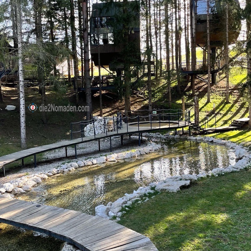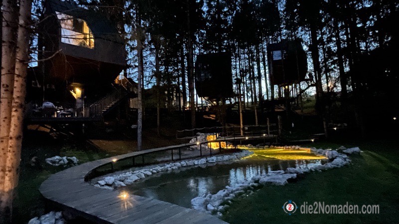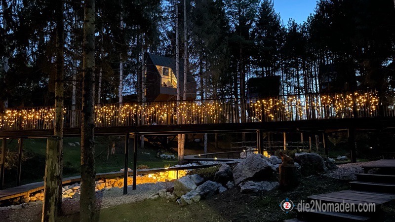 Wir landen mit Hrn. Hofrat, unserem selbst ausgebauten Kastenwagen, auf dem Ganzjahresplatz Plitvice Holiday Resort, der wirklich alle Stücke spielt. Ganz egal, ob man campen will oder eine andere Unterkunftsmöglichkeit braucht – hier gibt es große Indianer-Tippis, Mobilheime, Appartements und sogar Baumhäuser der Luxusklasse mit einem zweiten Stockwerk und das ganze inmitten eines kleinen Wäldchens mit einem kleinen Teich, Zuläufen und Stegen. Dem großen Bruder Plitvice nachgebaut und abends wunderschön beleuchtet.
