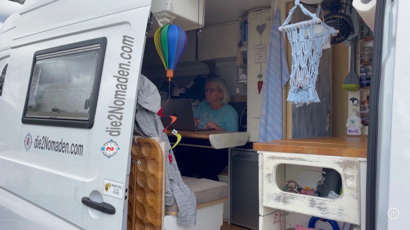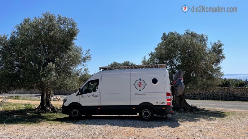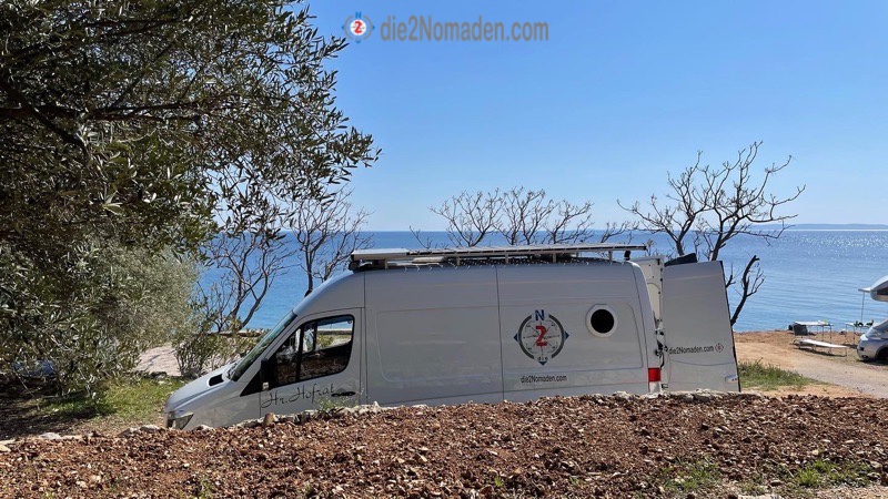 PLITVICE/CRO. Unser Camper steht perfekt in der Sonne und so macht das Arbeiten bei offener Schiebetüre auch Spaß.