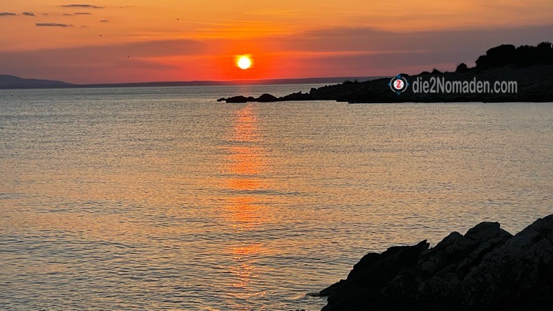 Schon bald kommt um diese Jahreszeit der Sonnenuntergang. Wenn die Sonne am Horizont verschwindet, wird es merklich kühler und wir beschließen, es uns im Camper gemütlich zu machen.