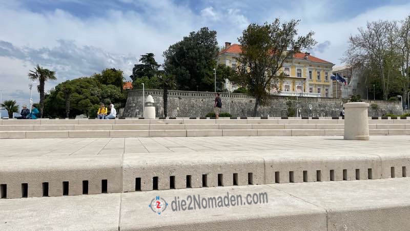 Am Ende der Uferpromenade hören wir schon von weitem Töne, die wir nicht einordnen können. Je näher wir kommen, umso mehr sind wir überzeugt, dass wir die schönen weißen Stufen der Meeresorgel von Zadar erreicht haben.