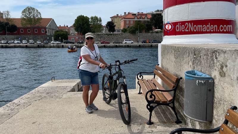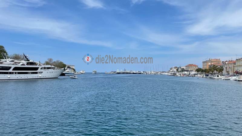 Vorbei am Hafen, in dem Unmengen von kleineren Booten bis zu großen Superjachten stehen, dem „Boatman from Zadar“, der für ein paar Kunas seine Gäste zum Eingang der Altstadt rudert, erreichen wir die Fußgängerbrücke und ketten am Fahrradstand unsere Bikes an.