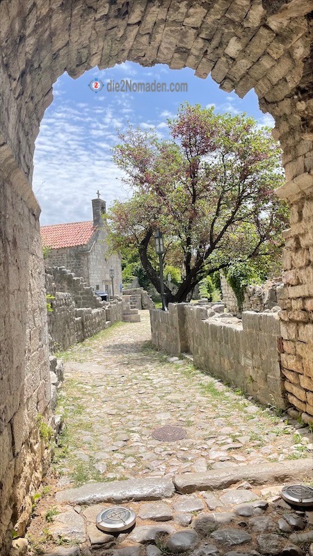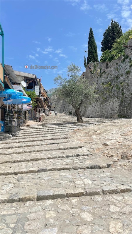 Wir verlassen 20 km später die Adria Magistrale, biegen links ab und sehen schon von weitem die alte Stadtmauer wie eine Festung am Berg. Direkt in Stari Bar finden wir etwa 10 min. später einen sehr zentral gelegenen Parkplatz und machen uns gemütlich auf den Weg.