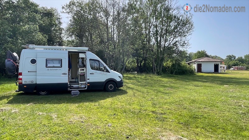 Nach dem Einchecken dürfen wir uns einen Platz auf einer nicht gemähten Wiese aussuchen, welche nicht einmal einen Blick auf den Strand zulässt. Die Suche nach einem geeigneten Stellplatz ähnelt eher einer Fahrt durch ein Minenfeld, da sehr viele „Kuhfladen“ in der Wiese verteilt waren.