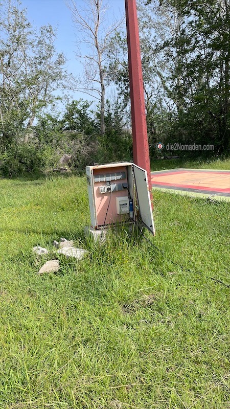 Der Platz kostet € 17,- und kann nicht ohne Strom gemietet werden. Nur ist der Stromkasten schon älteren Baujahres und die Türe ist verrostet und bleibt daher bei jedem Wetter sperrangelweit offen. Wie die Elektrik im Inneren so aussieht, brauchen wir hier nicht zu beschreiben.