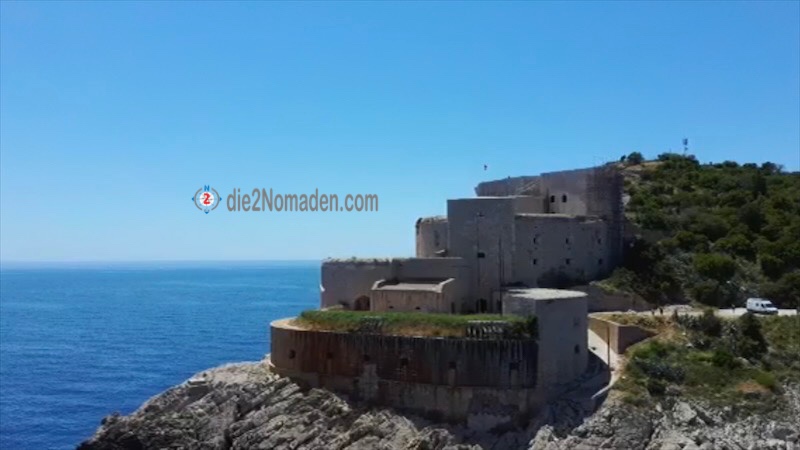 Beeindruckend ist die Größe dieser Festung und wie sie gebaut wurde; nämlich exakt an die Küste. Hier führt nicht einmal ein kleiner Steig rund um die Anlage, nur das kristallklare und tiefblaue Meer grenzt die Festung nach Süden hin ab.