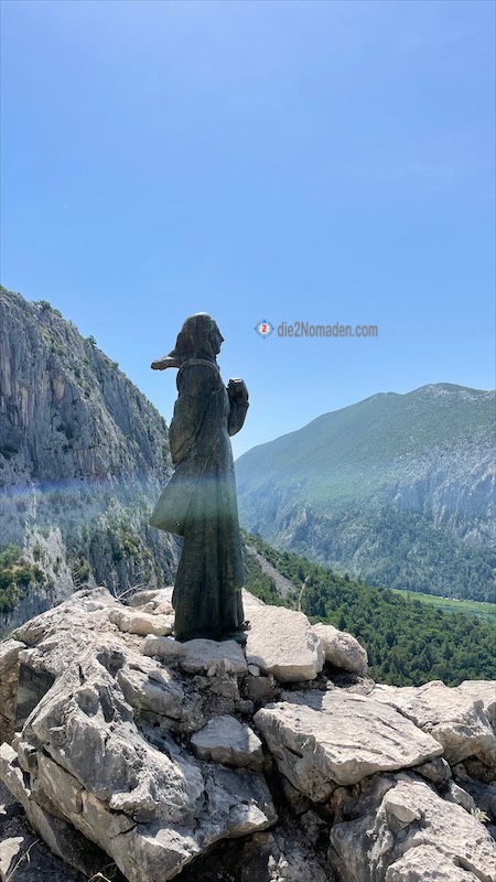 Und genau an dieser Stelle hoch oben, an welcher Mila Gojsalić sich das Leben genommen haben soll, steht heute ihr Denkmal. Vom Bildhauer Ivan Meštrović stammt die bekannte Statue Mila Gojsalić, die noch heute – lange nach ihrem Heldentod – über Poljica und Omiš wacht.“ (lust-auf-kroatien.de)