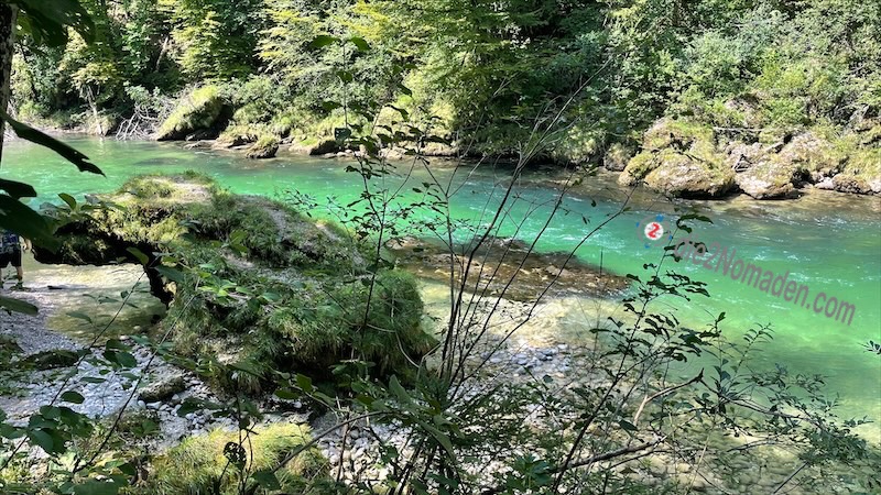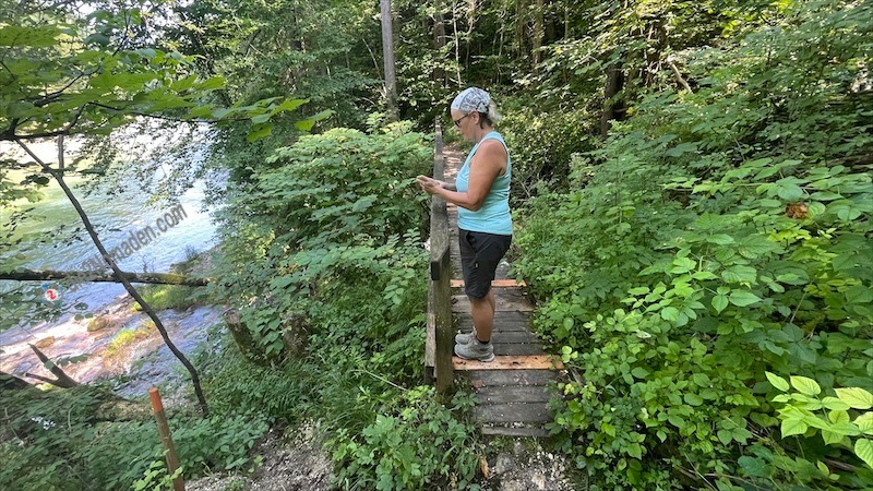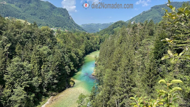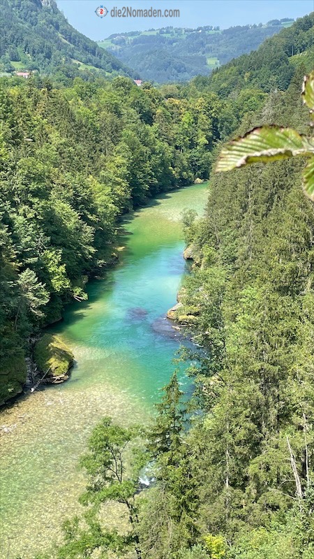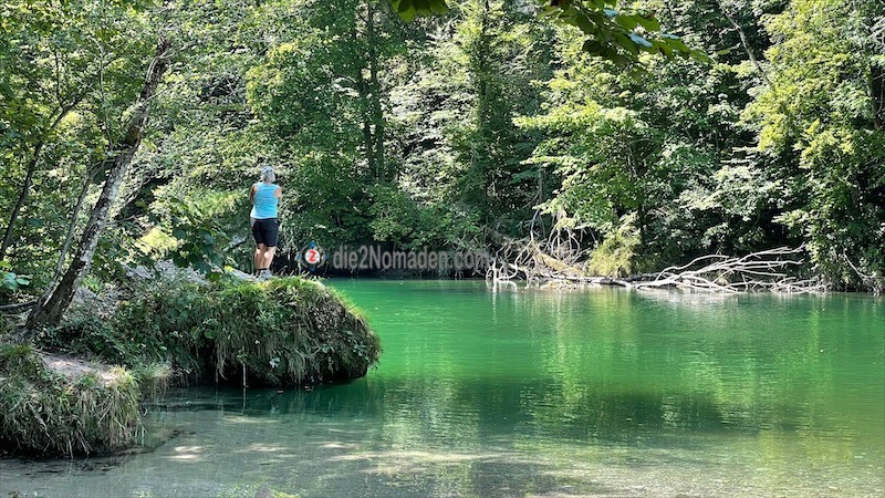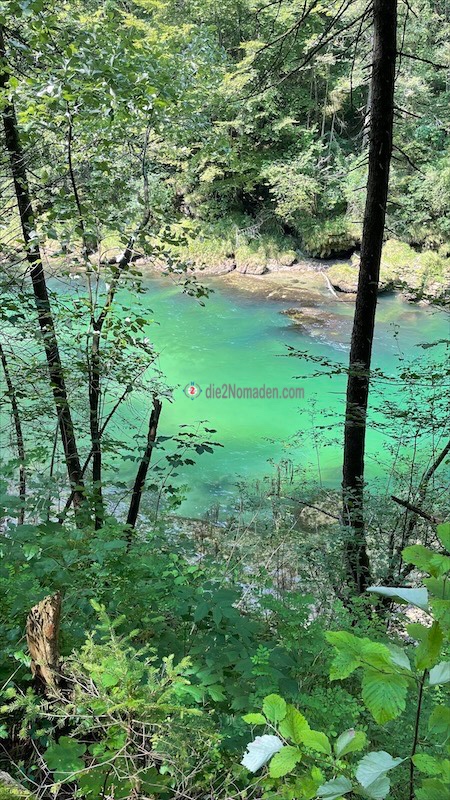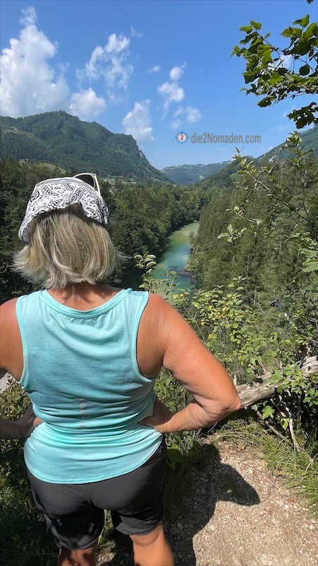 Bald führt uns unser Weg aber schon hinauf in einen lichten Wald und hier werden uns wunderschöne Ausblicke auf die unter uns liegende Steyr-Schlucht geboten, wo die Steyr grün und blau glitzert. Auch einige Schlauchboote und Kajaks sind bei diesem Wetter unterwegs und unter uns schwimmen sogar drei Taucher vorbei.