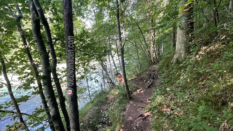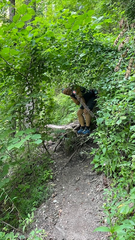 Dann geht es wieder hinab und wir werden auf einem Schild gewarnt, dass wir einen alpinen Steig betreten. Witzigerweise ist der aber keine Spur anders, als der vorherige Treppelweg. Nun ja, vielleicht noch viel verwurzelter.