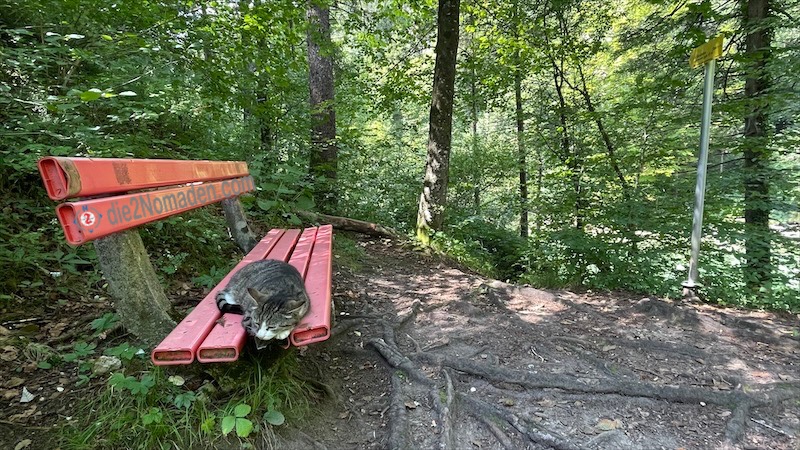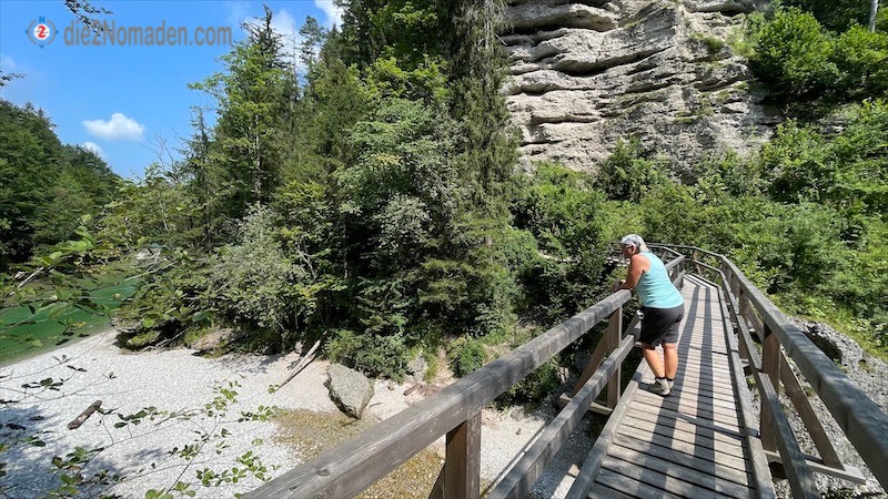 Nach einer kurzen Rast geht es wieder bergauf und wir beschließen, nicht den selben Weg zurück zu wandern, sondern Richtung Parkplatz Gradau über die Steyr-Schlucht-Aussicht zu marschieren. Auch hier geht es durch einen schattigen Wald mit tollen Ausblicken auf die Schlucht. Etliche Familien mit Kindern sind unterwegs. Schließlich geht es hinaus aus dem Wald in die heiße Sonne (wir hätten vielleicht doch den selben Weg wieder nehmen sollen), vorbei am Parkplatz Gradau und hinunter die Straße entlang nach Molln zu unserem geparkten Auto. Wir hätten definitiv den selben Weg wieder nehmen sollen!
