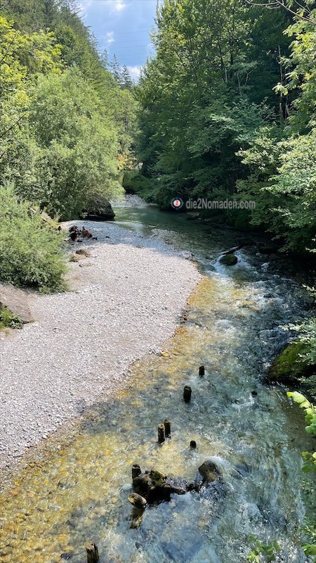 Nur ein kurzes Stück auf einer schmalen Straße (übrigens bestens markiert) und dann geht’s schon hinab zur Steyr, die uns rauschend willkommen heißt. Schon allein der Klang kühlt uns ab und wir tauchen ein in den Blätterwald.