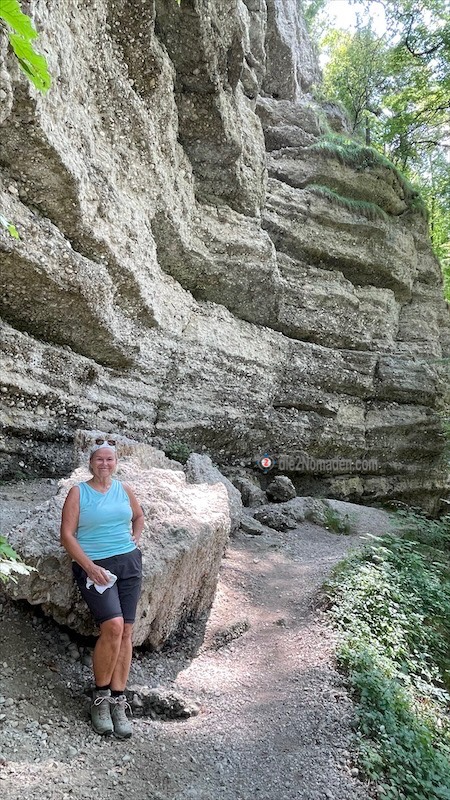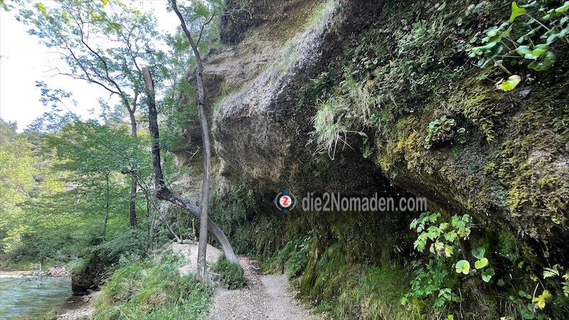 Immer entlang der Steyr führt uns unser schmaler, manchmal schon sehr ausgewaschener und wurzelreicher Weg über kleine Brücken, vorbei an einem kleinen Wasserfall und wunderschönen Schotterbuchten, wo es sich schon die einen oder anderen bequem gemacht haben. Die hohen Wände aus porösem Gestein, an denen wir vorbeikommen beziehungsweise auch darunter durchgehen, beeindrucken uns sehr und wir hoffen, dass das auch da oben bleibt, wo es grad ist.